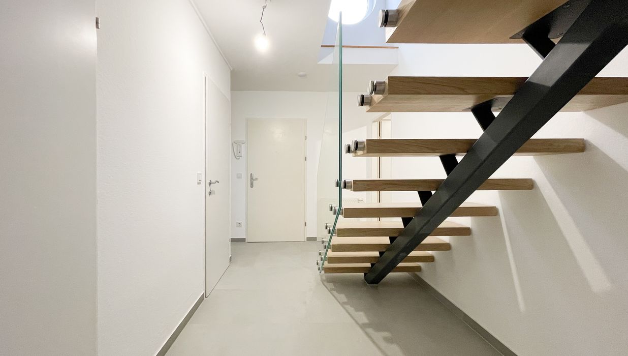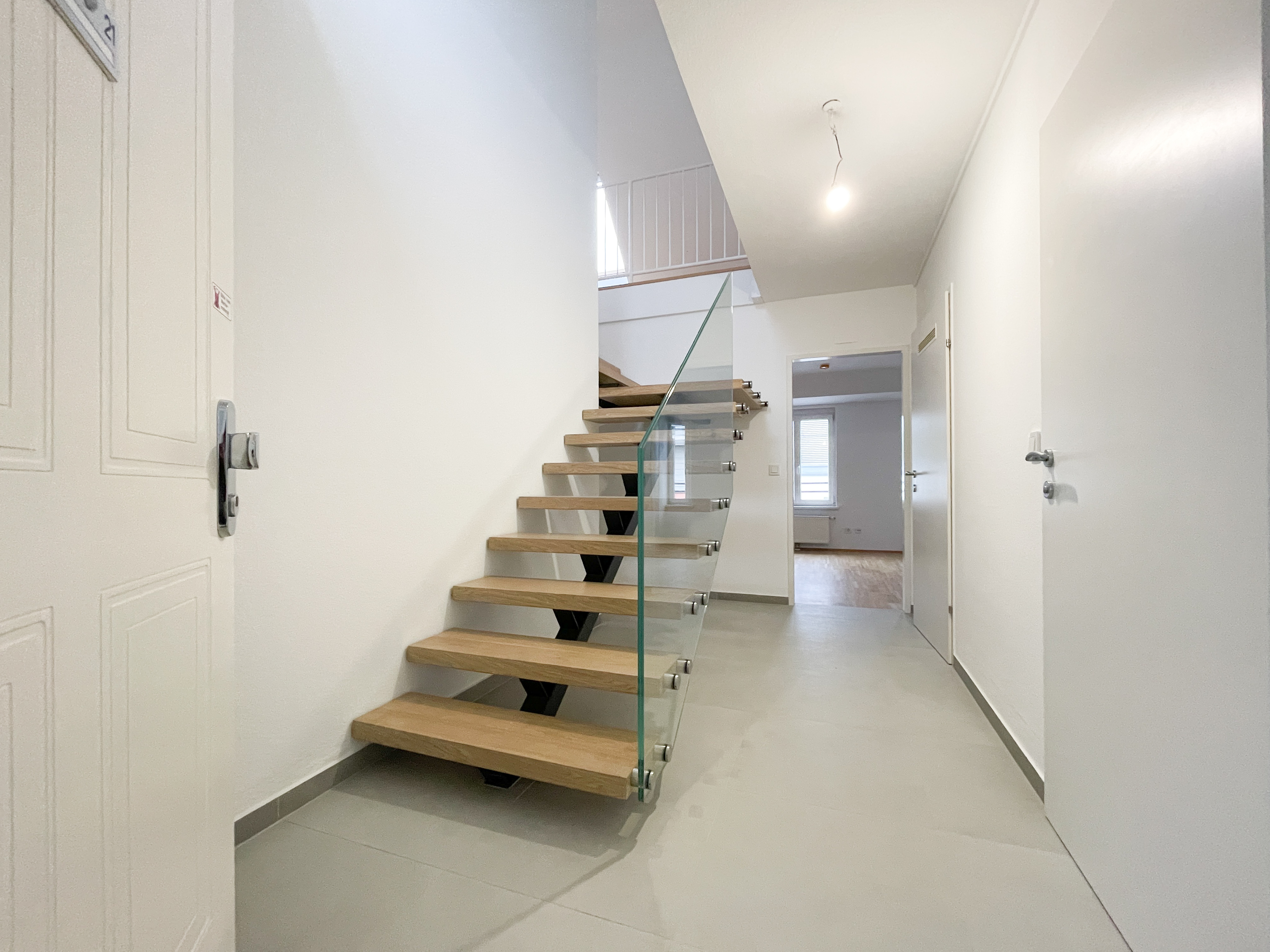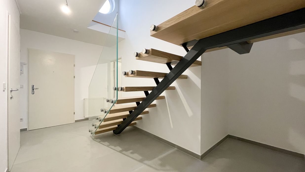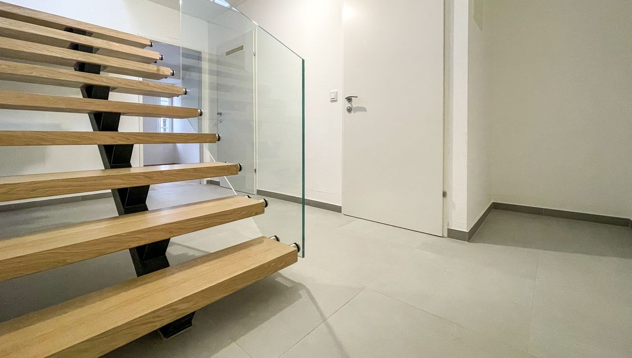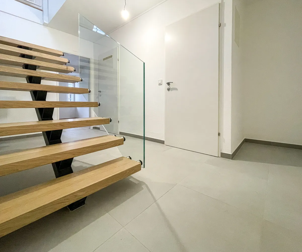 Der gesamte Fliesenboden im Vorraum und Abstellraum wurde gegen neue moderne großformatige Steinzeug-Fliesen getauscht und der Treppenaufgang mit stylischer Glaswand wurde ebenfalls komplett erneuert.