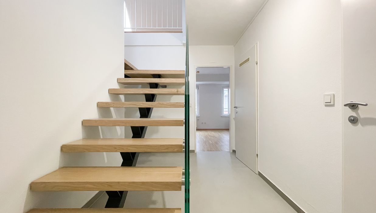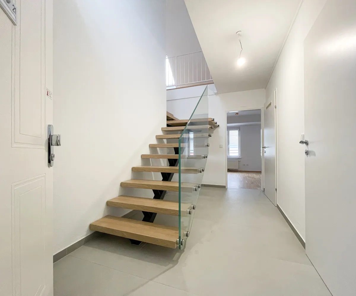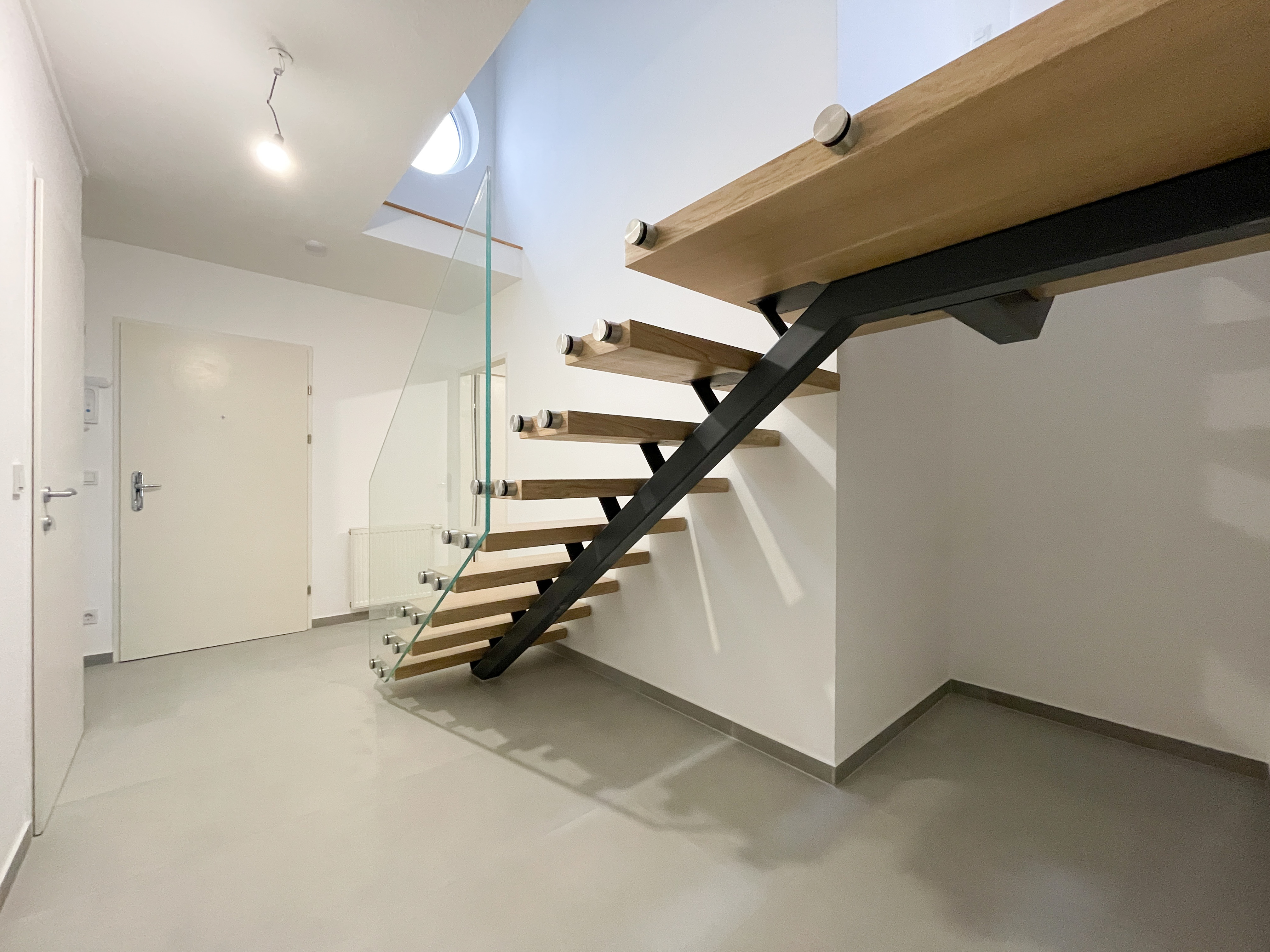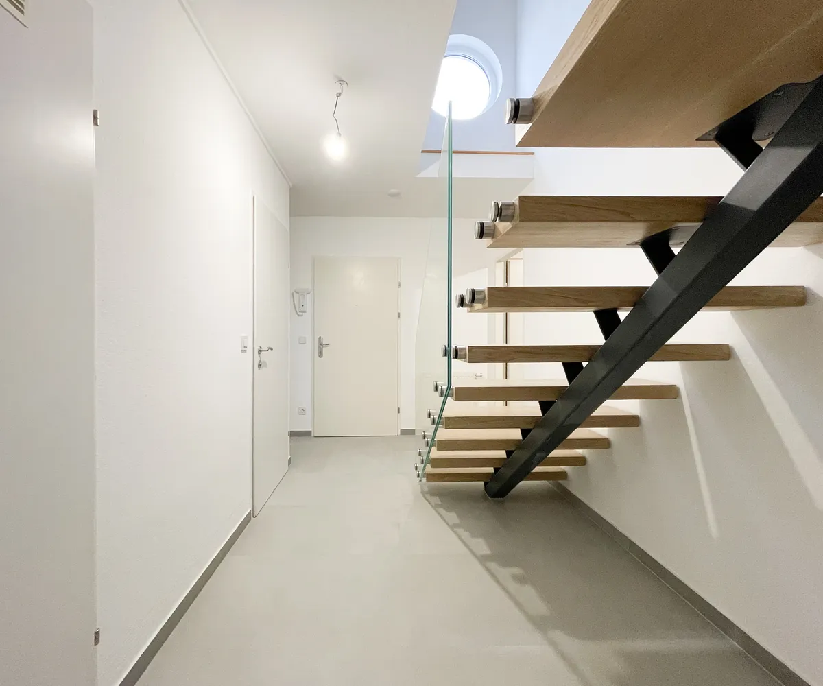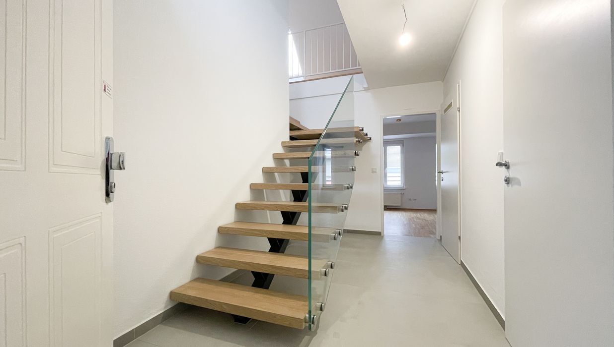 Der gesamte Fliesenboden im Vorraum und Abstellraum wurde gegen neue moderne großformatige Steinzeug-Fliesen getauscht und der Treppenaufgang mit stylischer Glaswand wurde ebenfalls komplett erneuert.