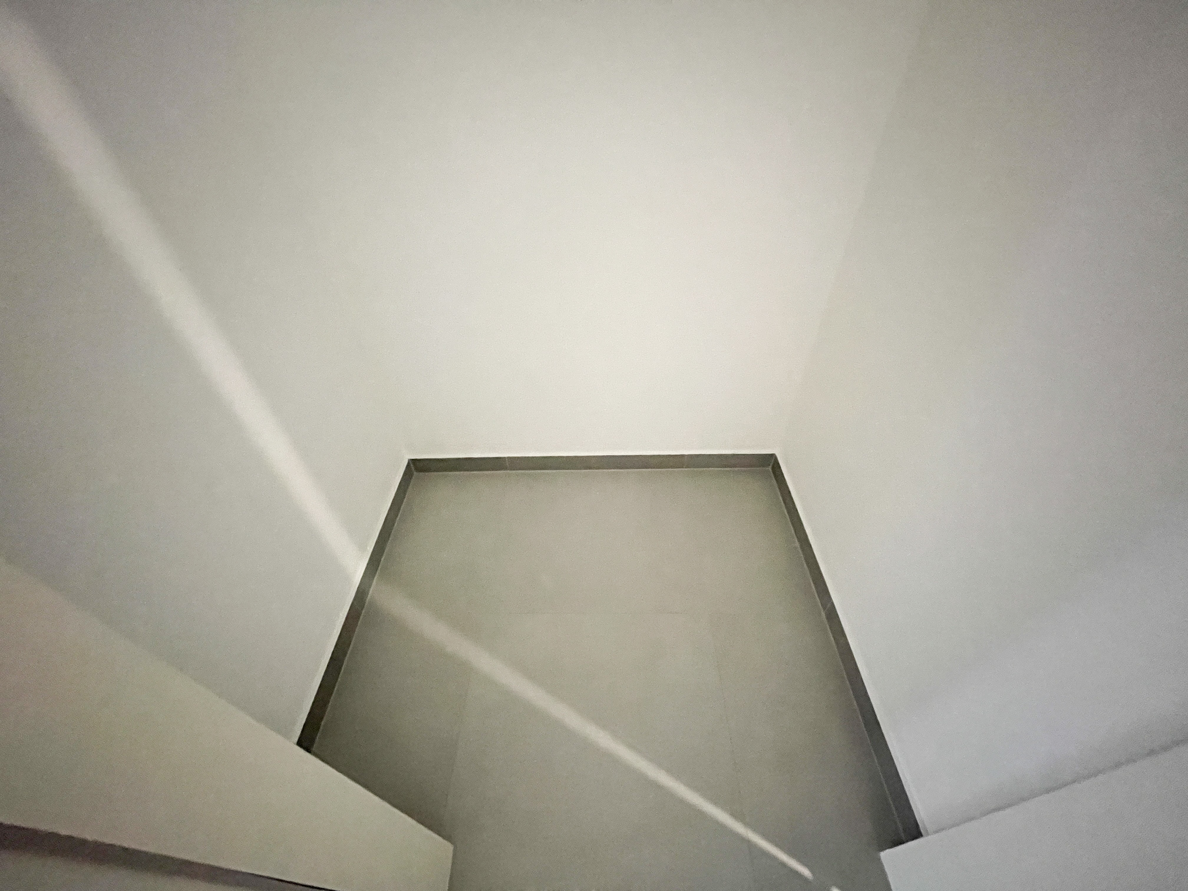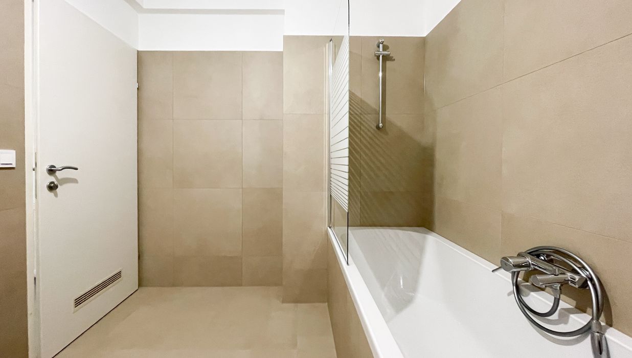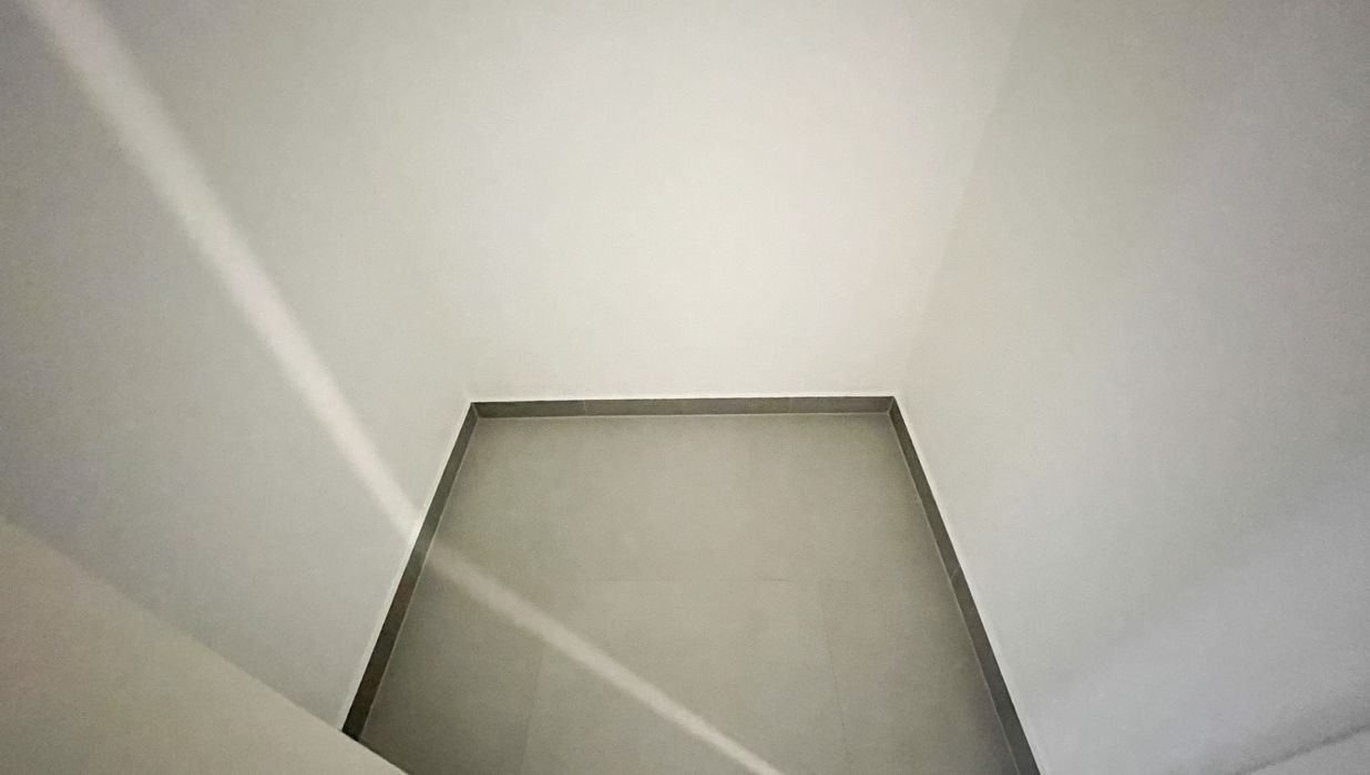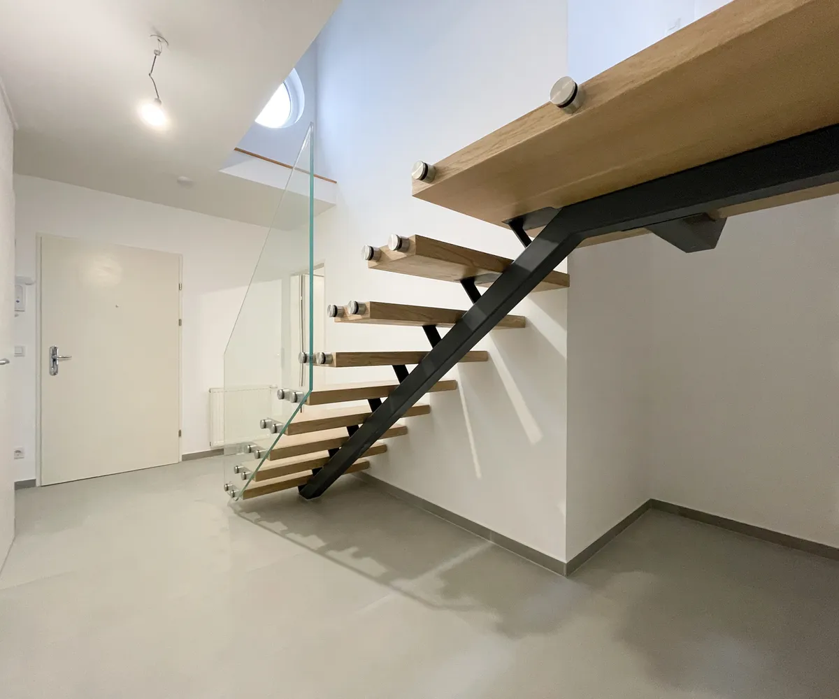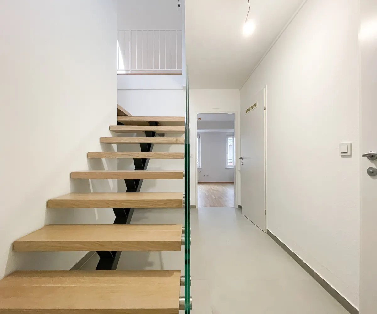 Der gesamte Fliesenboden im Vorraum und Abstellraum wurde gegen neue moderne großformatige Steinzeug-Fliesen getauscht und der Treppenaufgang mit stylischer Glaswand wurde ebenfalls komplett erneuert.
