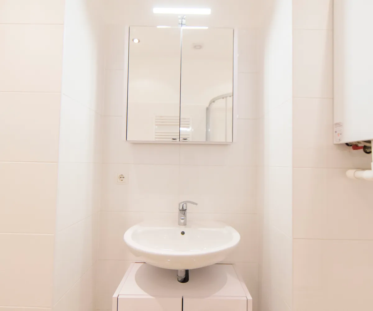 Die Wohnung liegt im 3. Obergeschoß eines Altbaus mit einer prunkvoll verzierten Fassade und Personenaufzug. Sie verfügt über zwei Zimmer mit idealer Größe, einer Küche, einem Badezimmer mit Dusche sowie WC und Wasschmaschinenanschluss.
