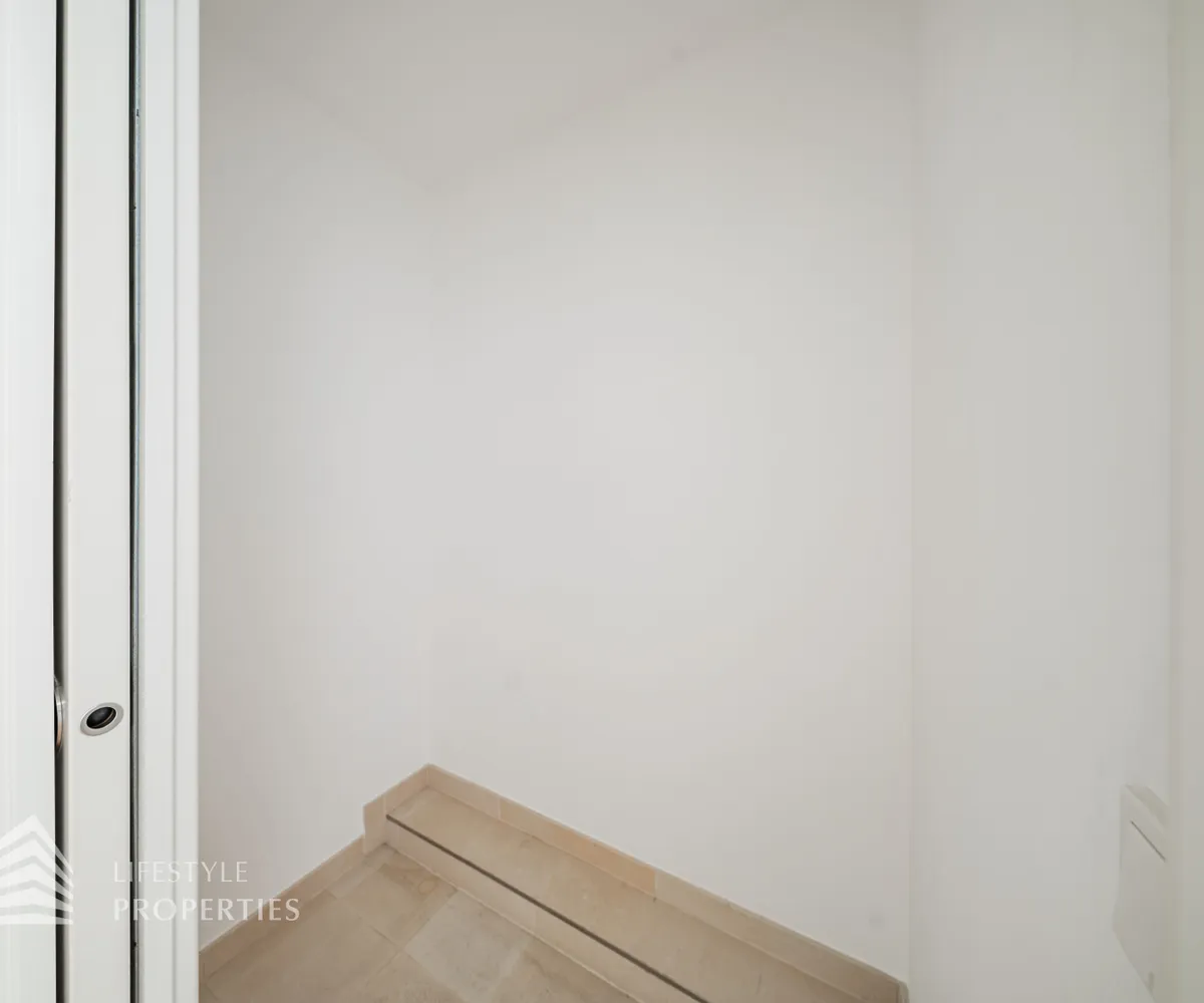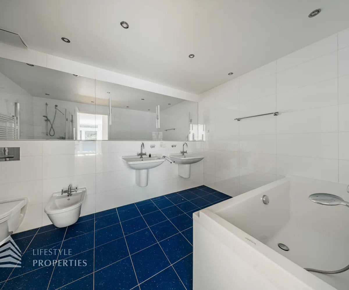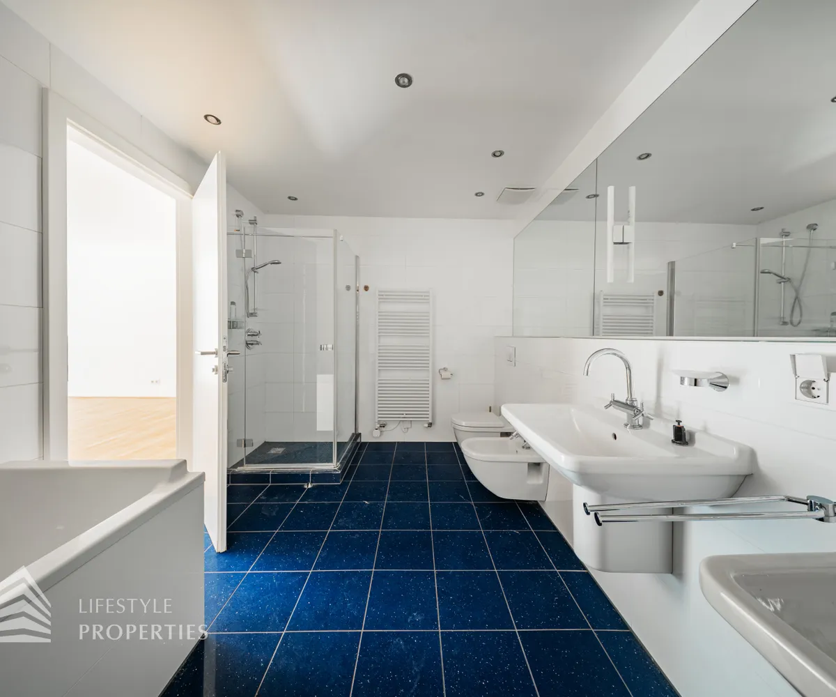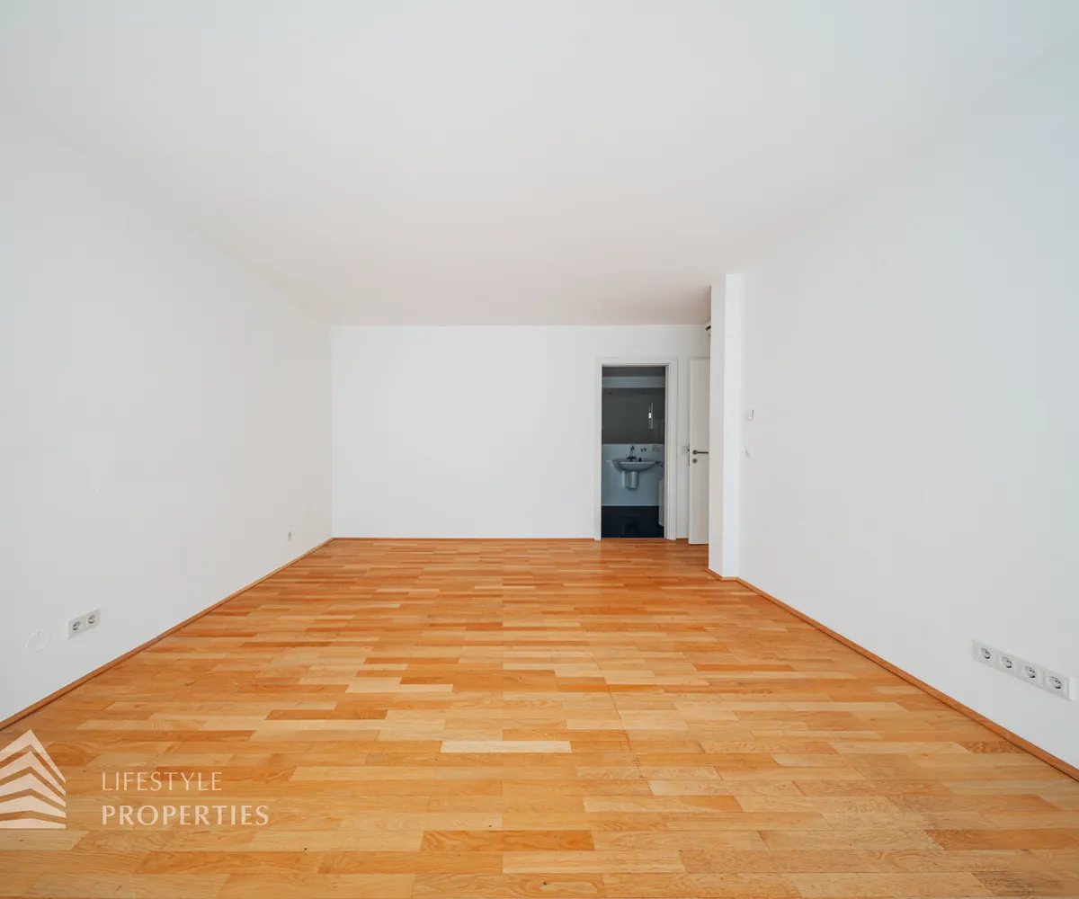 Sie betreten die Wohnung und befinden sich im Entrée. Gerade durch gelangen Sie in den hellen Salon mit abgetrennter Kochnische. Der Wohnraum bietet genügend Platz für einen großen Esstisch und eine gemütliche Sitzecke, weiters haben Sie hier direkten Zugang auf die große Terrasse und einen der Balkone, die einen wunderschönen Blick ins Grüne bieten. Vom Wohnraum gelangen Sie zu den drei Schlafzimmern, die mit einer Türe vom Wohnbereich abgegrenzt sind. Eines der Zimmer hat ein en-suite Badezimmer, welches mit Wanne, Dusche, Doppelwaschbecken und WC ausgestattet ist. Das zweite Bad ist auch mit einer Wanne, einer Dusche, einem Waschbecken und einem WC ausgestattet und auch der Hauswirtschaftsraum befindet sich in diesem Teil der Wohnung. Von allen drei Schlafzimmern haben Sie Zugang zum zweiten Balkon. Im Vorraum befinden sich des Weiteren ein separates WC, ein Abstellraum und eine Garderobe.