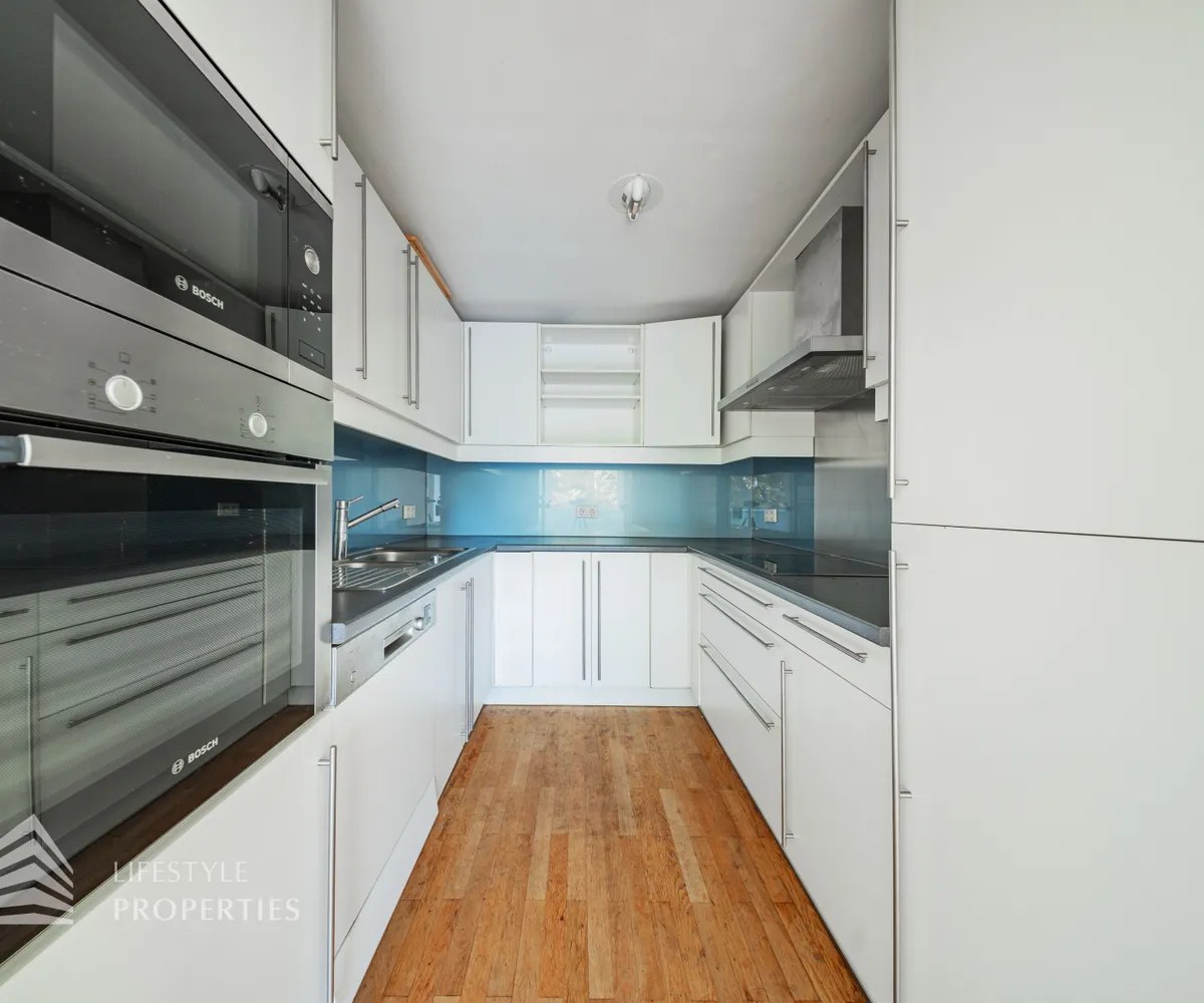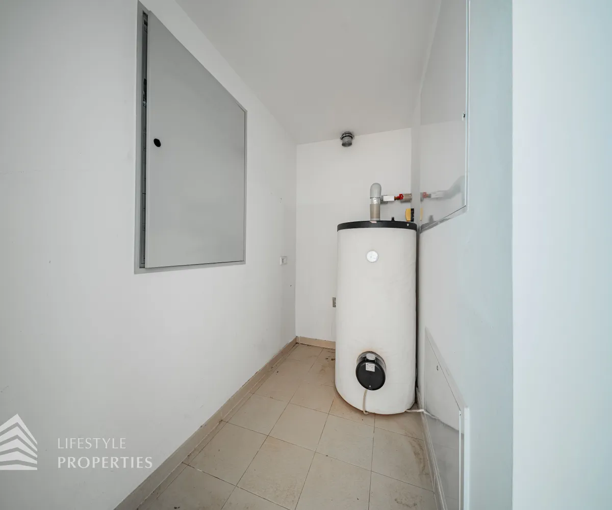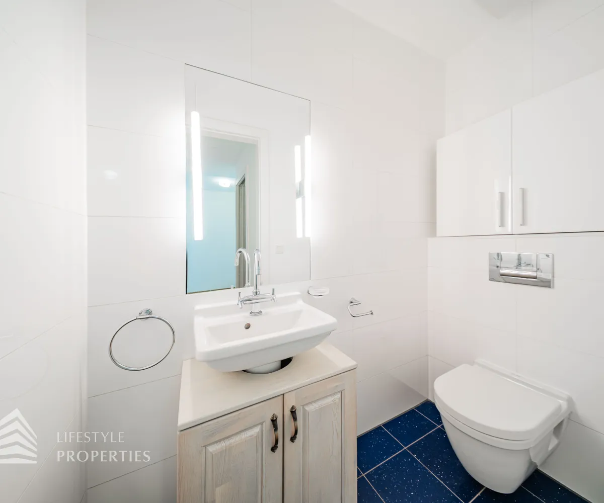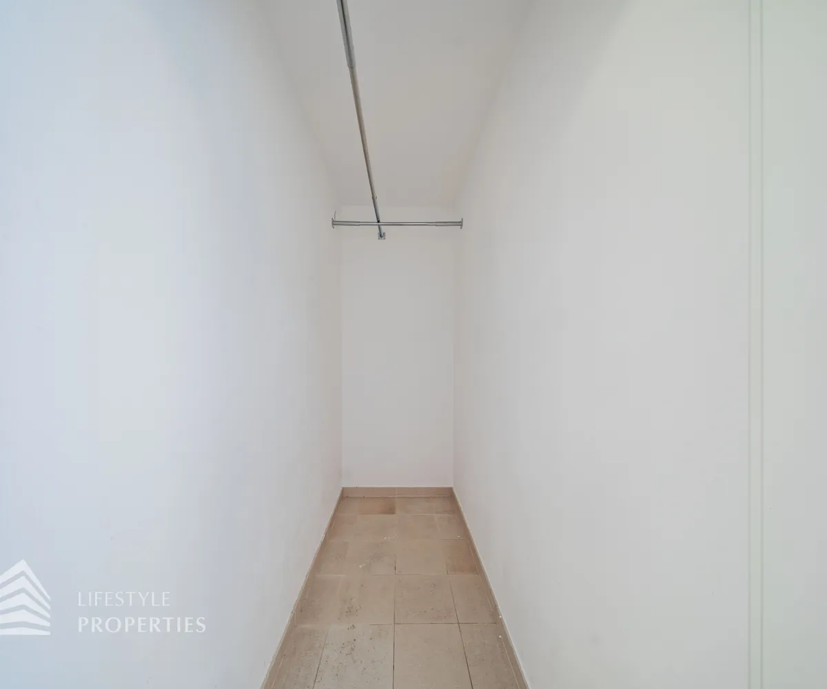 Sie betreten die Wohnung und befinden sich im Entrée. Gerade durch gelangen Sie in den hellen Salon mit abgetrennter Kochnische. Der Wohnraum bietet genügend Platz für einen großen Esstisch und eine gemütliche Sitzecke, weiters haben Sie hier direkten Zugang auf die große Terrasse und einen der Balkone, die einen wunderschönen Blick ins Grüne bieten. Vom Wohnraum gelangen Sie zu den drei Schlafzimmern, die mit einer Türe vom Wohnbereich abgegrenzt sind. Eines der Zimmer hat ein en-suite Badezimmer, welches mit Wanne, Dusche, Doppelwaschbecken und WC ausgestattet ist. Das zweite Bad ist auch mit einer Wanne, einer Dusche, einem Waschbecken und einem WC ausgestattet und auch der Hauswirtschaftsraum befindet sich in diesem Teil der Wohnung. Von allen drei Schlafzimmern haben Sie Zugang zum zweiten Balkon. Im Vorraum befinden sich des Weiteren ein separates WC, ein Abstellraum und eine Garderobe.
