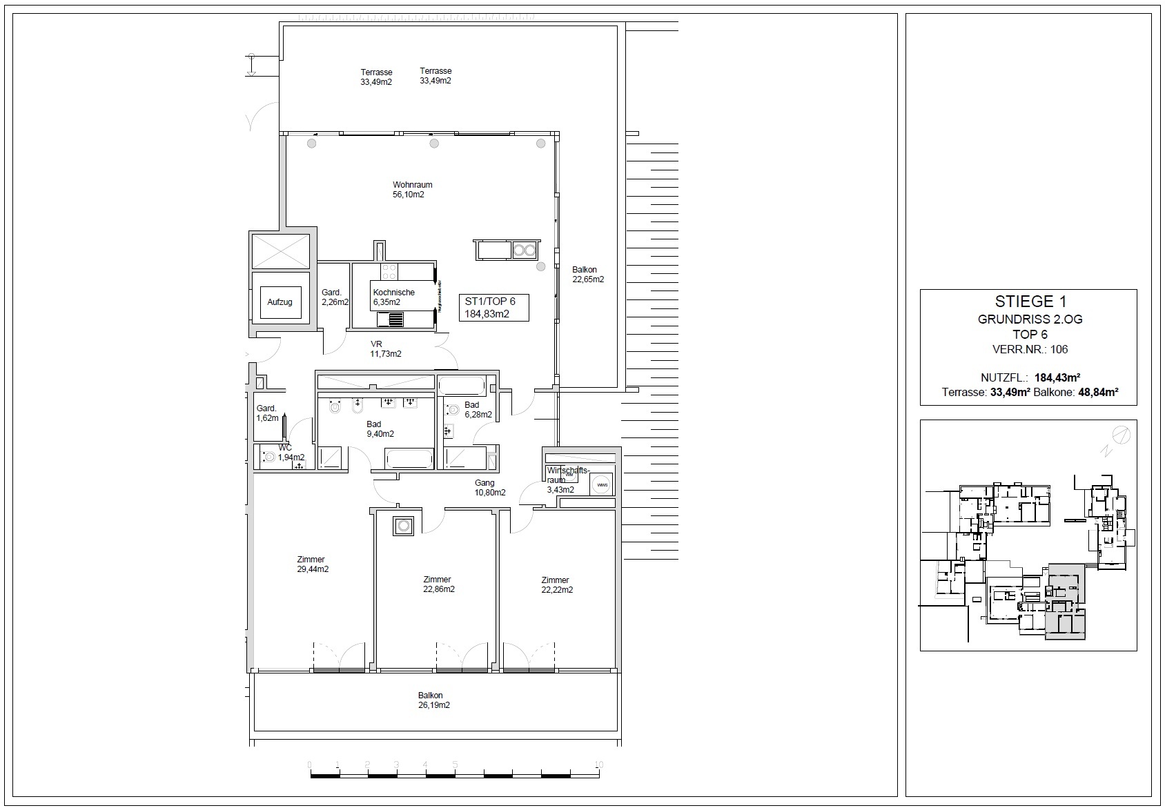 Die Wohnung befindet sich in einem im Jahre 1966 gebauten Neubau, liegt im 2. Stock und ist bequem über einen Lift erreichbar. Sie verfügt über eine Größe von ca. 184 m² und gliedert sich in einen Vorraum, einen großen Wohnraum, drei getrennt begehbare Zimmer, eine Küche, zwei Bäder, einen Wirtschaftsraum, einen Abstellraum, eine Garderobe, einen Balkon, eine Terrasse und separates WC.