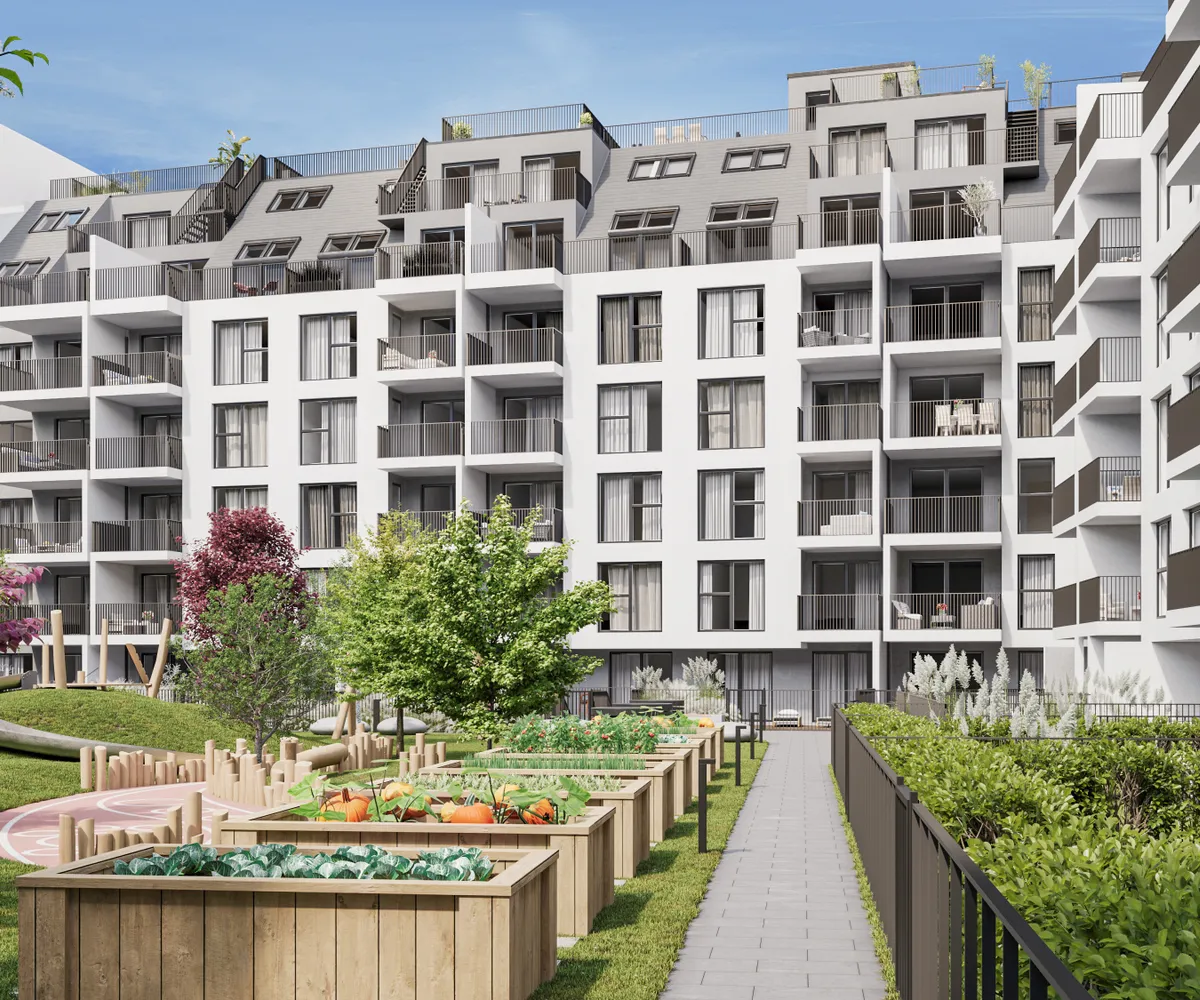 Das Herzstück des Projekts ist der knapp 1.000 m² große Innenhof, der den Bewohnern exklusiv zur Verfügung steht und u.a. zum Verweilen und Urban Gardening einlädt. Eine Ruheoase und Rückzugsort, der seinesgleichen sucht und das direkt vor Ihrer Wohnungstür.