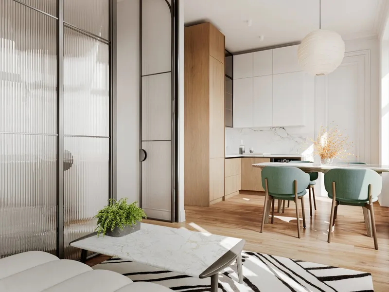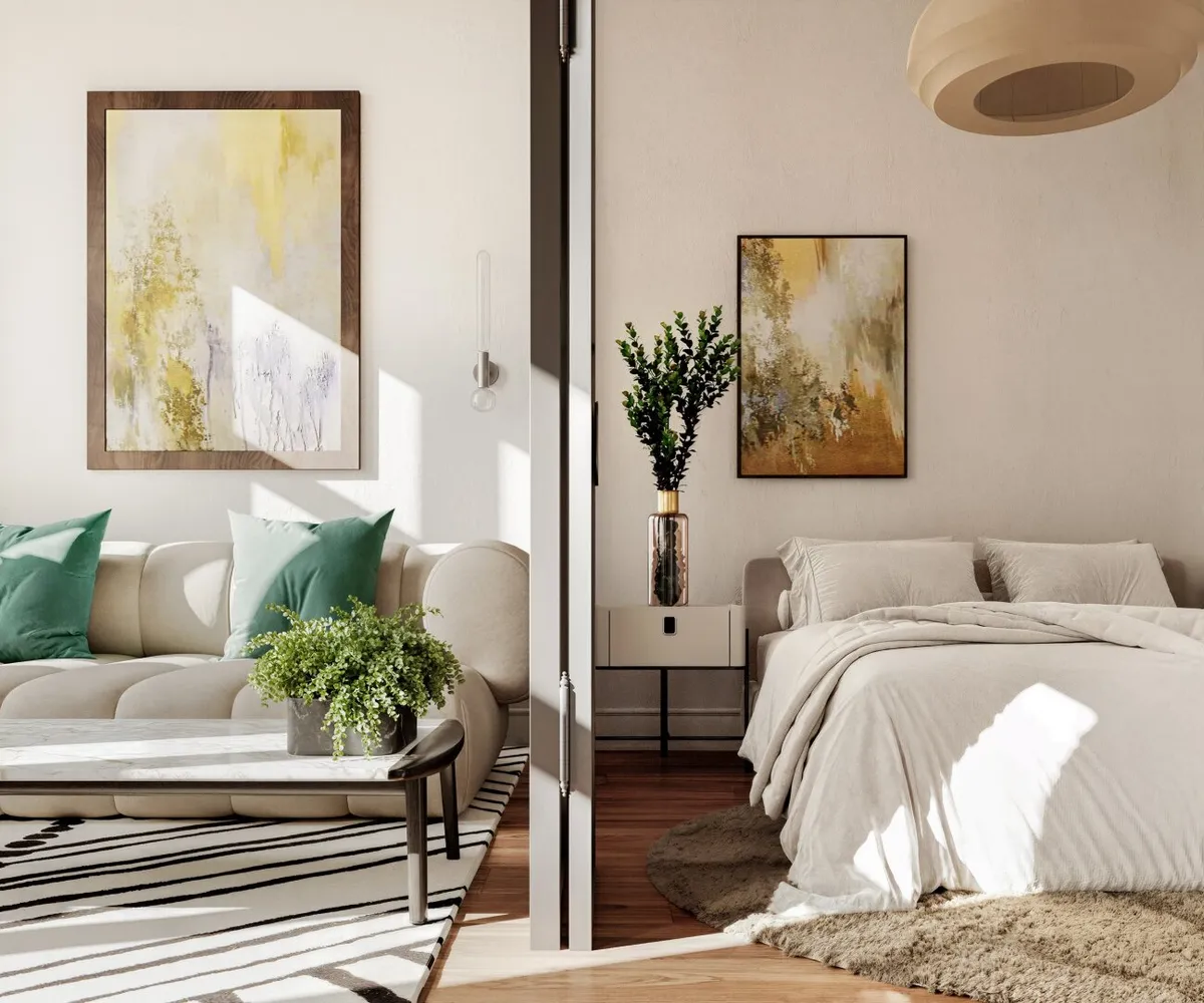Besonders raffiniert: Die moderne Glaswand mit Schiebetür trennt das Schlafzimmer optisch ab, ohne Licht oder Luftigkeit zu nehmen. So entsteht ein loftartiger Eindruck – mit zusätzlicher Privatsphäre für den Schlafbereich , in dem sich auch ein Kleiderschrank perfekt einfügt. Gleichzeitig bleibt im Wohnbereich ausreichend Platz für eine ausziehbare Couch – ideal, wenn einmal Gäste übernachten möchten.