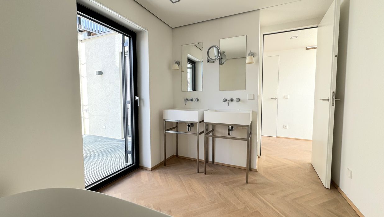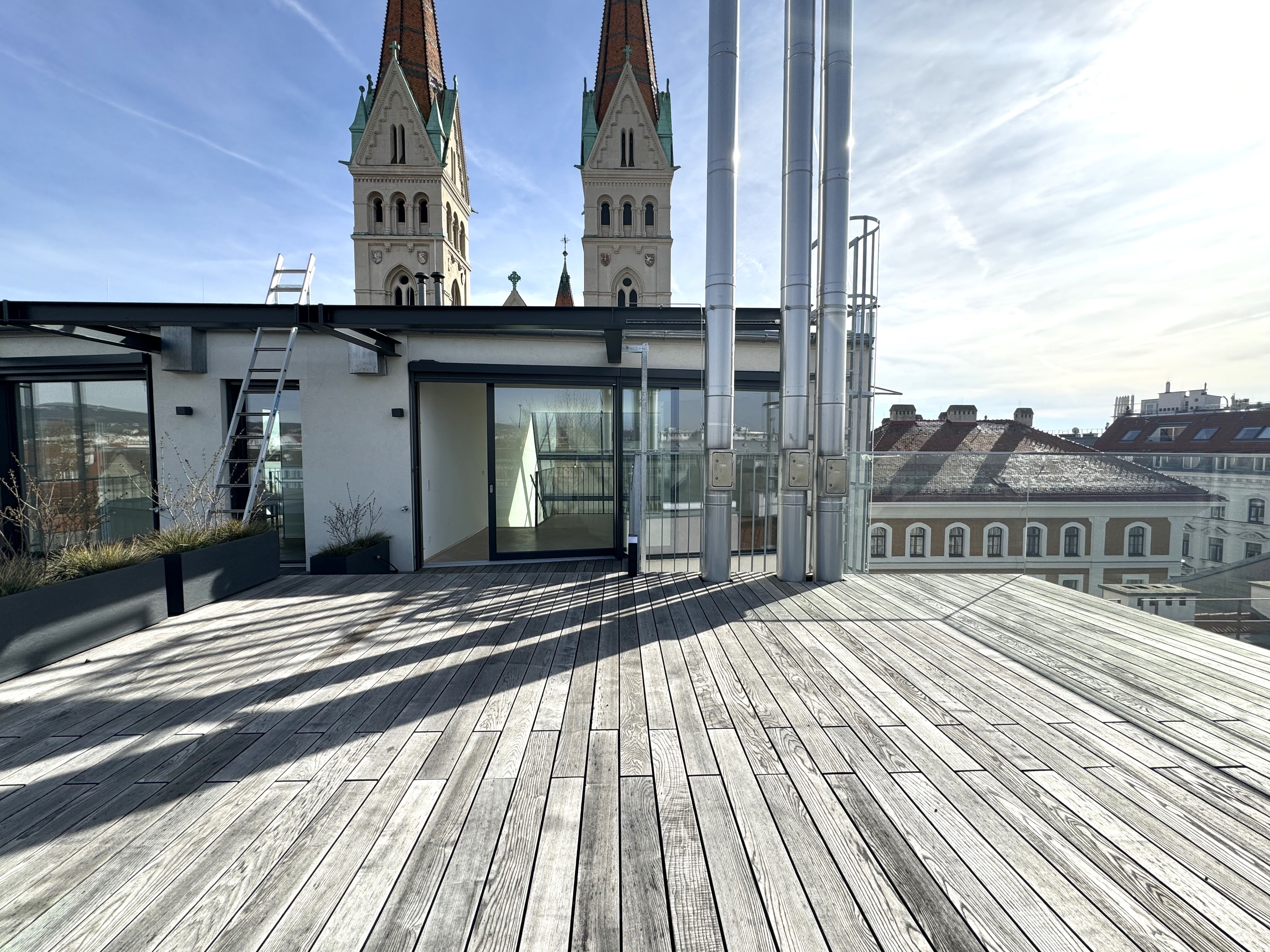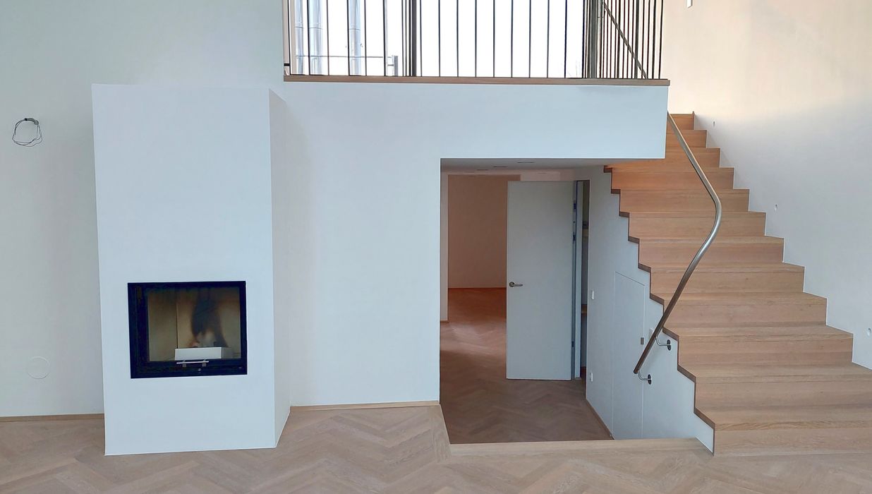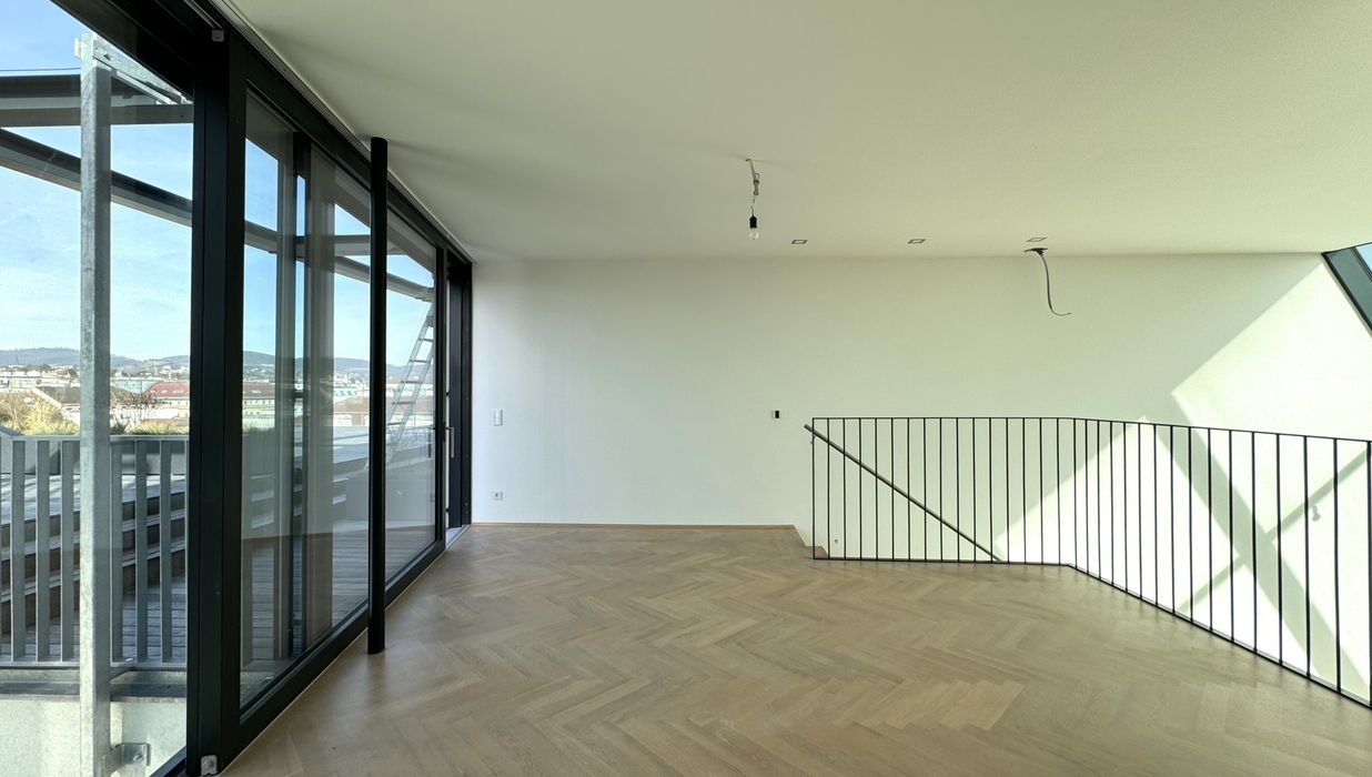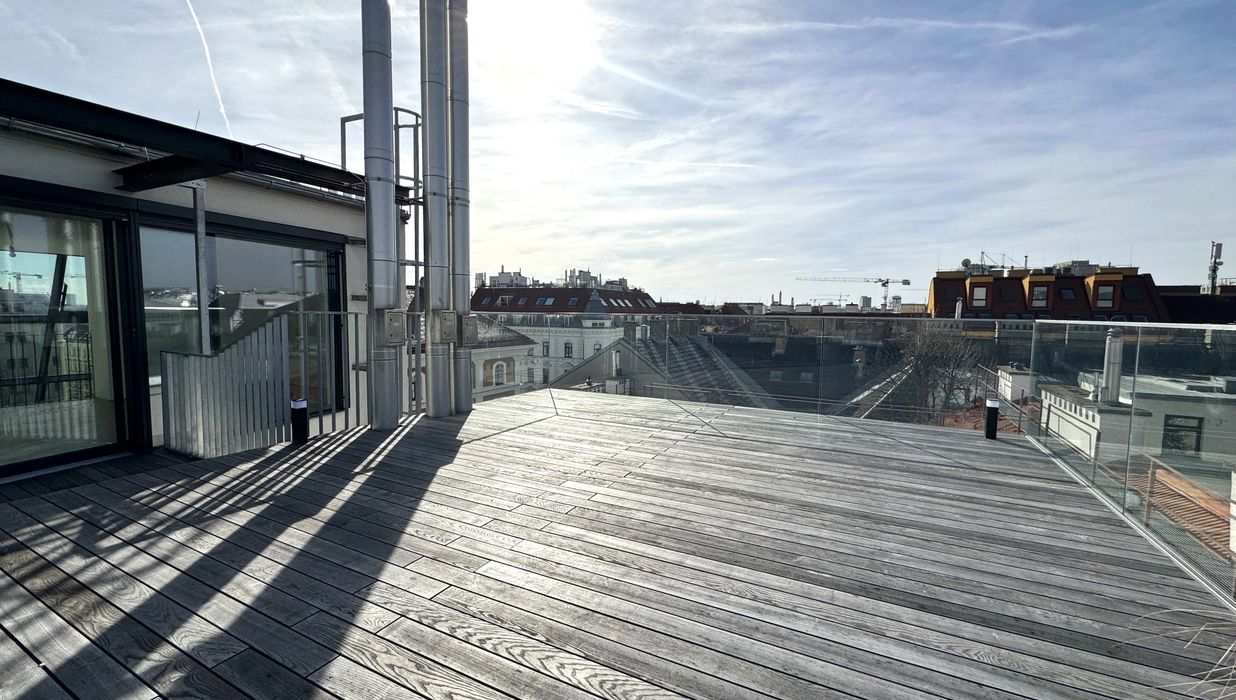 Über eine elegante Treppe erreichen Sie das Herzstück der Wohnung: die offen gestaltete Wohnküche. Lichtdurchflutet, weitläufig und stilvoll – dieser Raum lädt zum gemeinsamen Kochen, Lachen und Genießen ein. Die großflächigen Hebe-Schiebetüren führen auf ein echtes Highlight: eine fast 50 m² große Terrasse mit spektakulärem Ausblick über Wien bis hin zum Kahlenberg. Ob Sonnenaufgang beim Frühstück oder Sundowner mit Freunden – dieser Ort wird zum Lieblingsplatz über den Dächern der Stadt.
