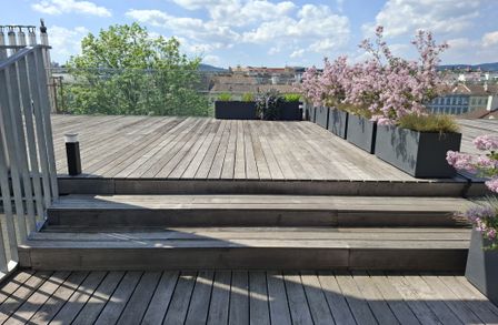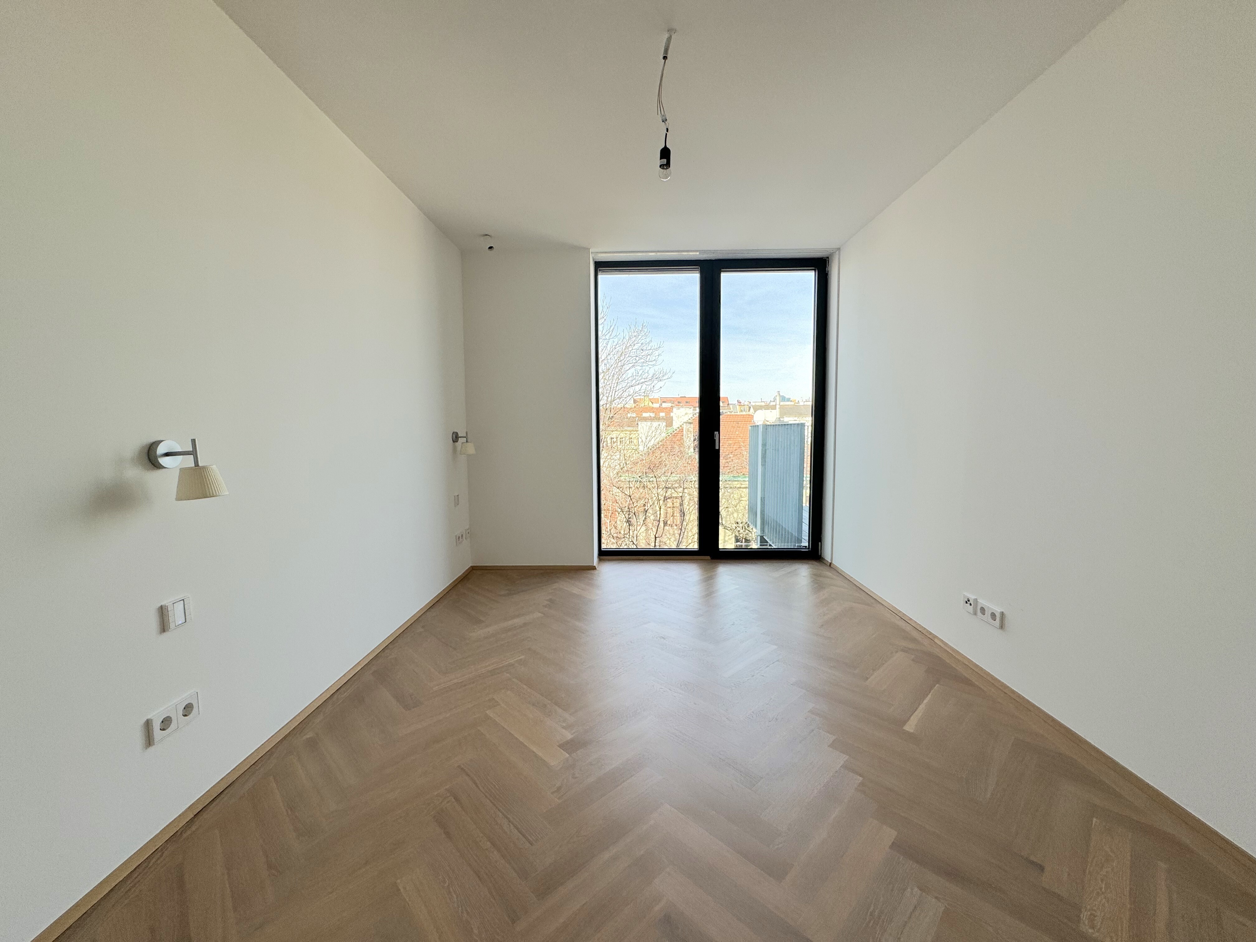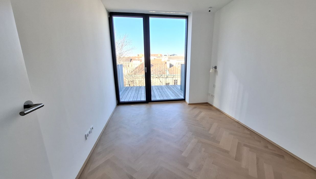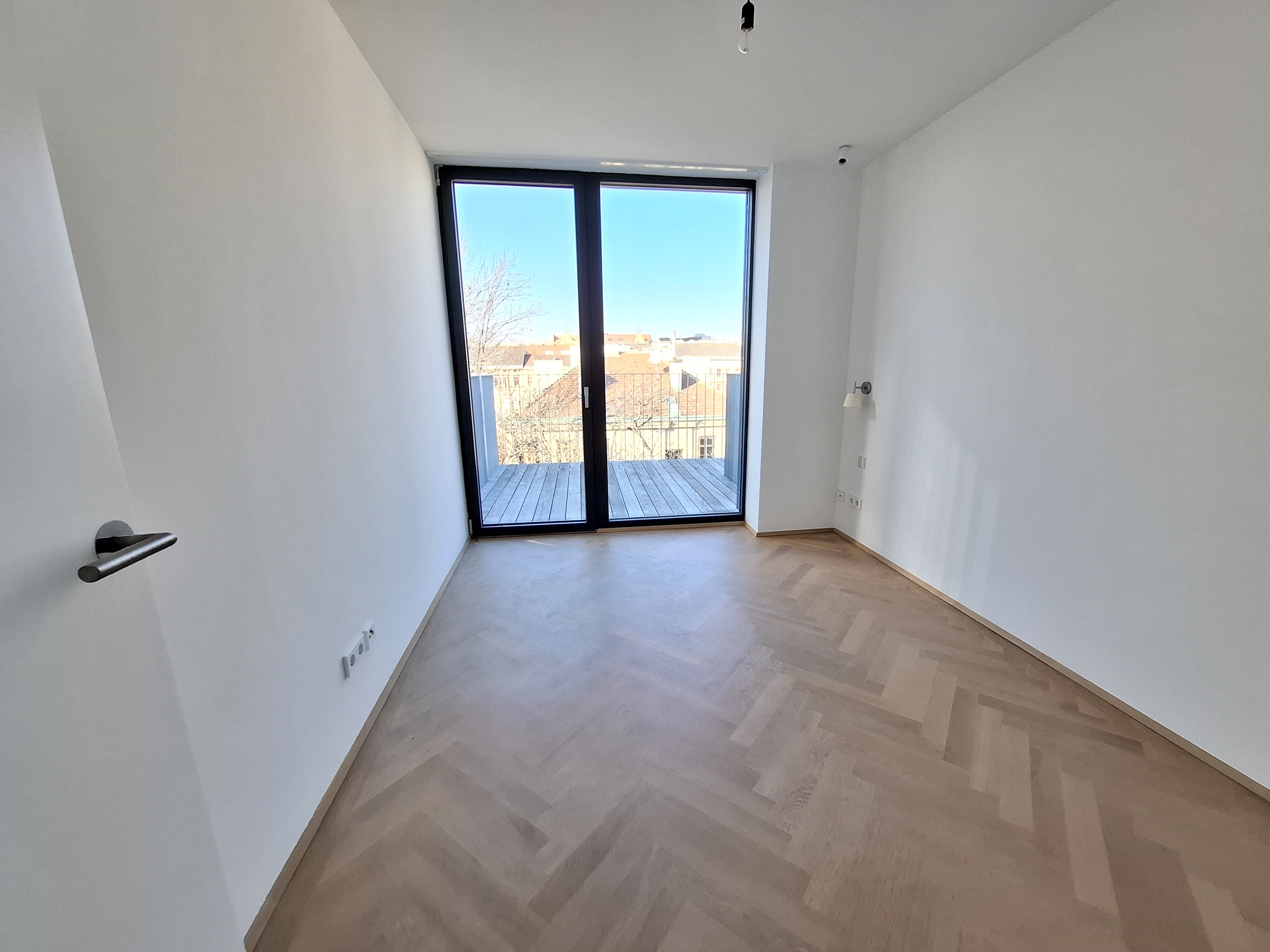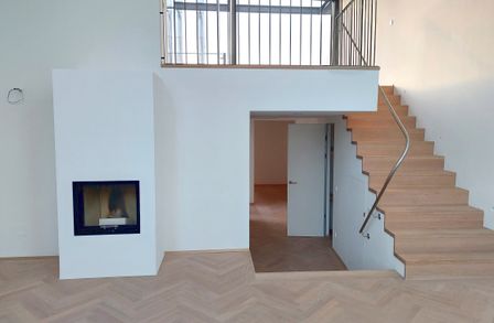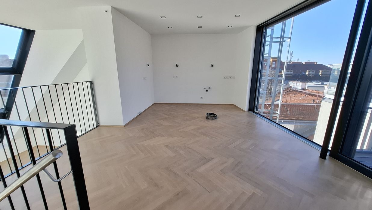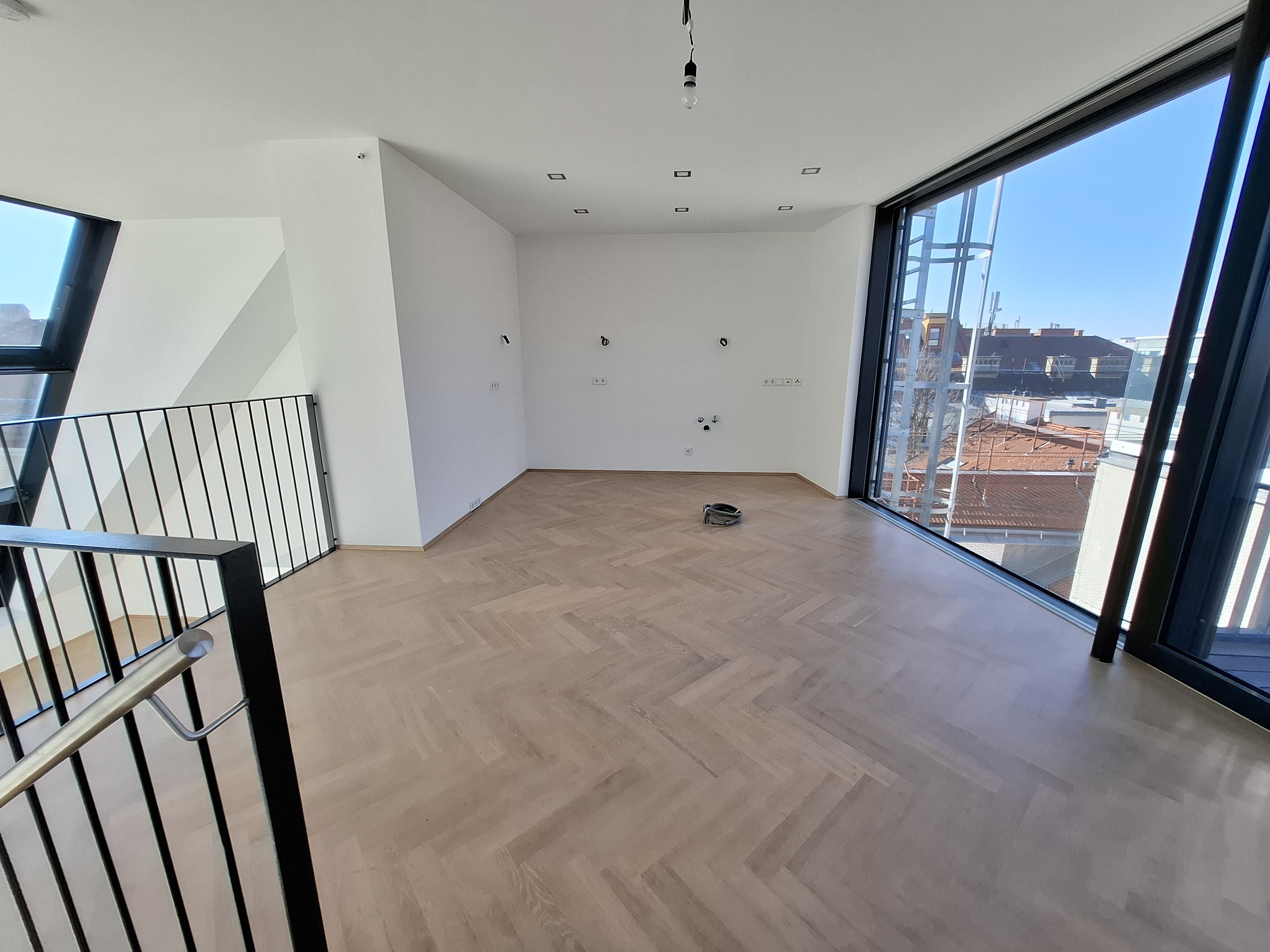 Über eine elegante Treppe erreichen Sie das Herzstück der Wohnung: die offen gestaltete Wohnküche. Lichtdurchflutet, weitläufig und stilvoll – dieser Raum lädt zum gemeinsamen Kochen, Lachen und Genießen ein. Die großflächigen Hebe-Schiebetüren führen auf ein echtes Highlight: eine fast 50 m² große Terrasse mit spektakulärem Ausblick über Wien bis hin zum Kahlenberg. Ob Sonnenaufgang beim Frühstück oder Sundowner mit Freunden – dieser Ort wird zum Lieblingsplatz über den Dächern der Stadt.