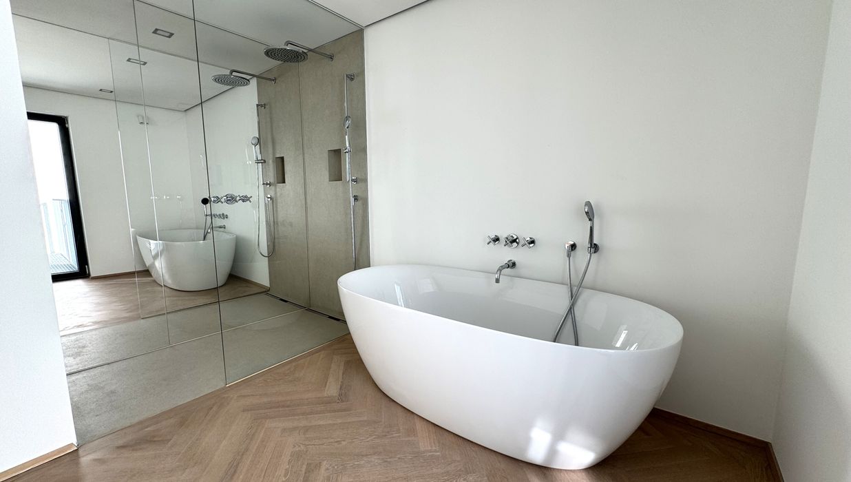 Zwei ruhige Schlafzimmer, ein elegantes Badezimmer mit freistehender Wanne, großzügiger Walk-in-Dusche und Doppelwaschbecken, ein separates WC, ein praktischer Abstellraum sowie ein charmanter Balkon – all das bietet die untere Etage. Jeder Raum ist durchdacht gestaltet, hochwertig ausgestattet und schafft eine Balance zwischen Funktion und Schönheit.