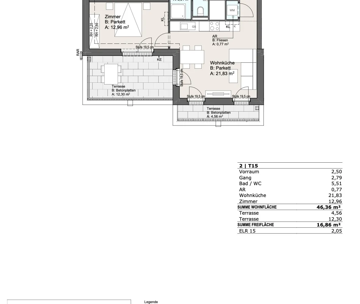Die Wohnung befindet sich im 3. Liftstock und bietet ca. 46 m² Wohnfläche. Zwei Terrassen mit einer Gesamtfläche von ca. 17 m² erstrecken sich über die gesamte Wohnbreite und schaffen durch großflächige Fensterflächen ein helles, freundliches Ambiente.