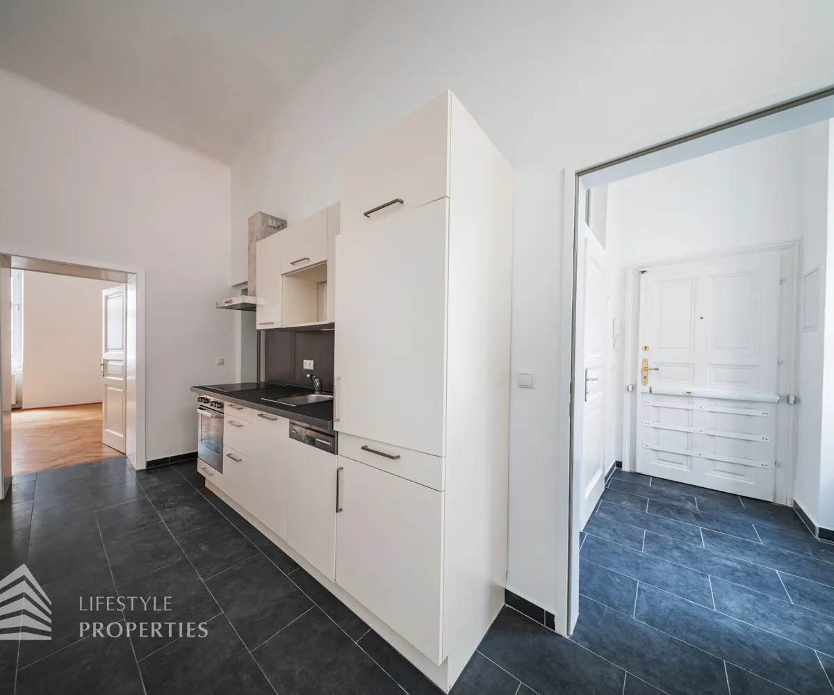 Sie betreten die Wohnung und befinden sich im Vorraum, gerade durch gelangen Sie in die voll ausgestattete Küche. Von hier gelangen Sie einerseits in das helle Wohnzimmer und in das Schlafzimmer. Das Badezimmer ist mit einer Badewanne, einem Handtuchtrockner, einem Waschmaschinenanschluss und einem Waschbecken ausgestattet. Das separate WC befindet sich auch im Vorraum. Die Wohnräume sind mit schönem Parkettboden ausgestattet und die Nassräume und die Küche sind verfliest.