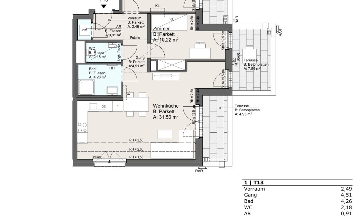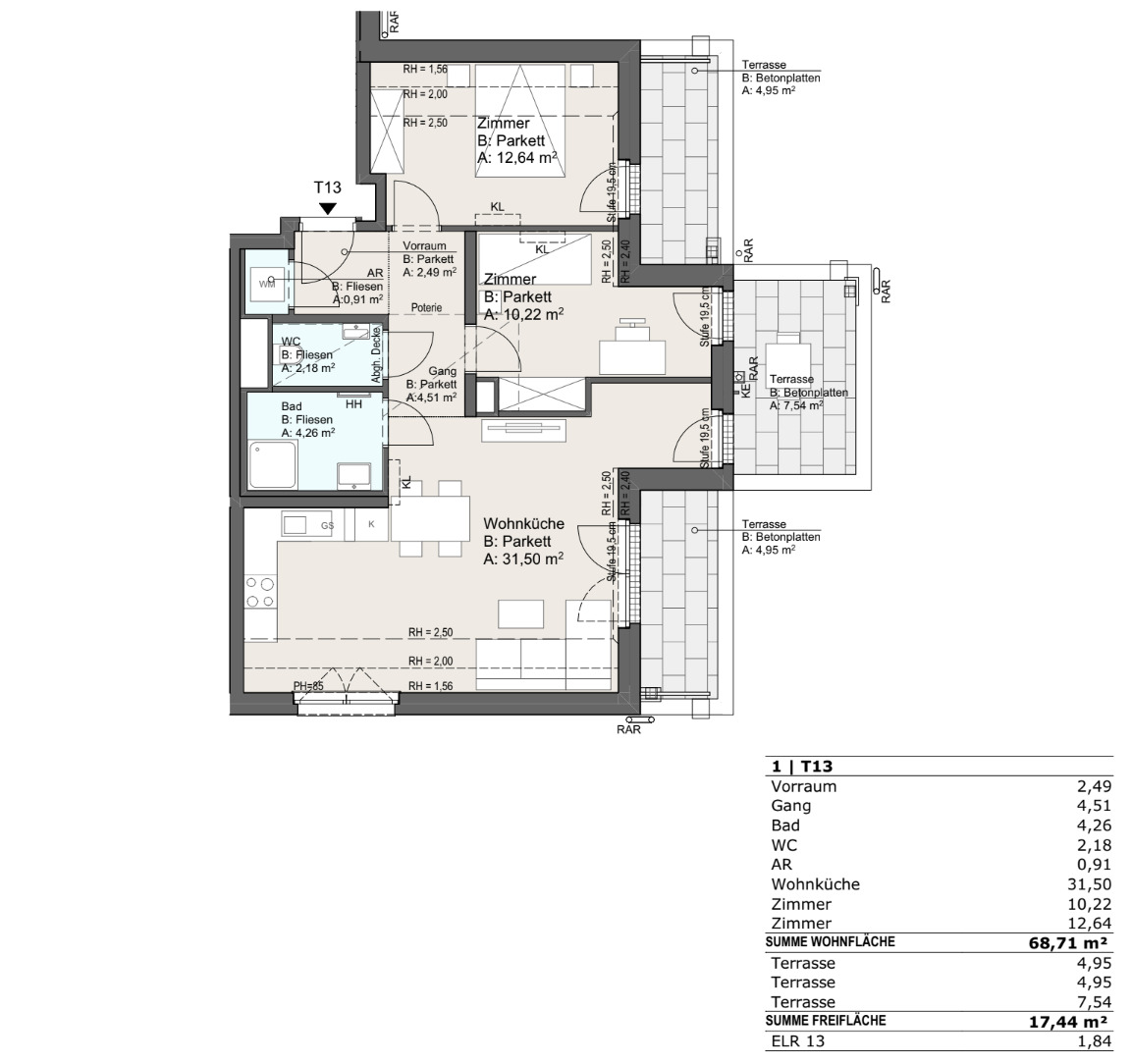 – Terrassen: ca. 4,95 m² + ca. 4,95 m² + ca. 7,54 m²