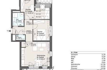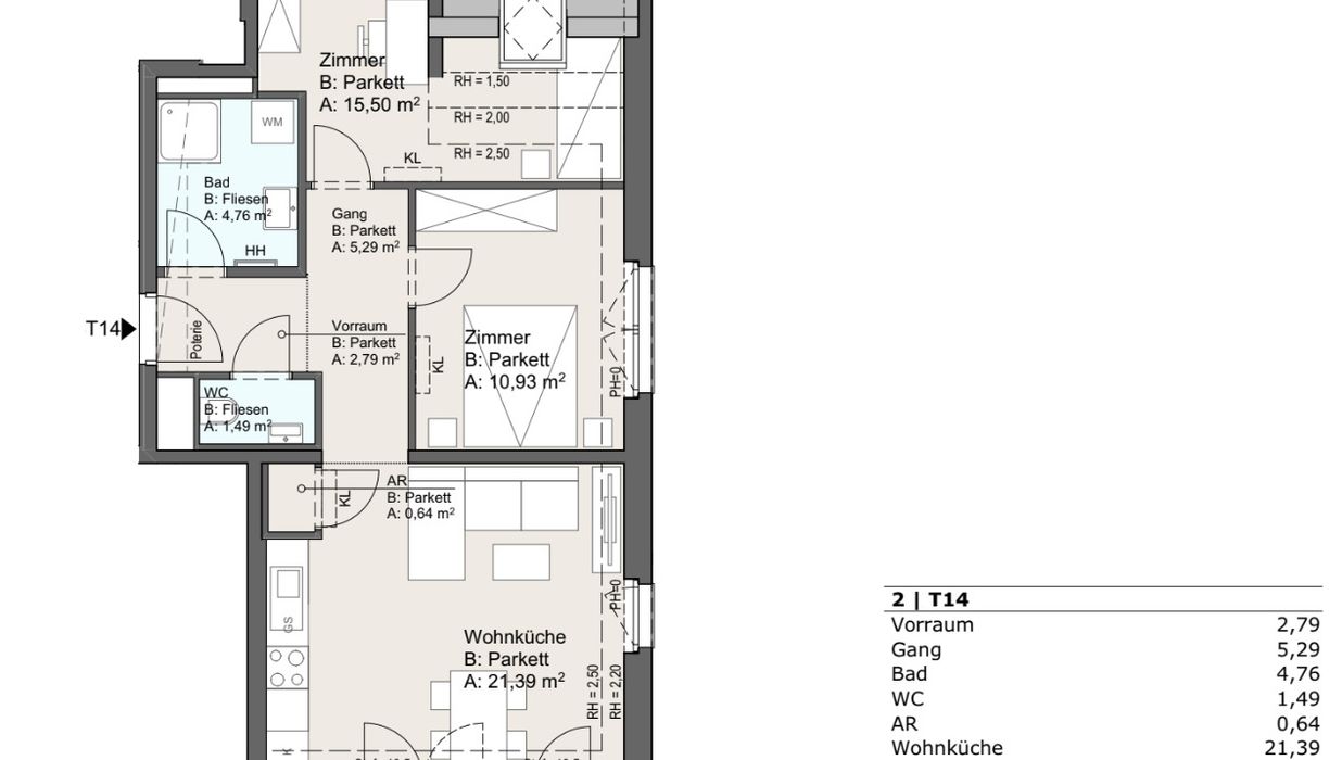 Die Wohnung befindet sich im 3. Liftstock und bietet ca. 63 m² Wohnfläche. Alle Räume sind zentral vom Vorraum aus begehbar. Zwei Terrassen mit einer Gesamtfläche von ca. 14 m² befinden sich gegenüberliegend – die größere ist direkt an die Wohnküche angebunden.