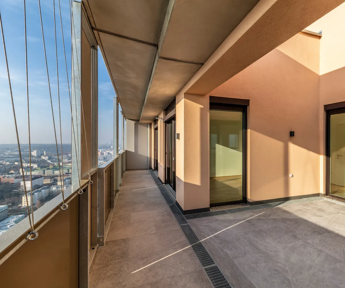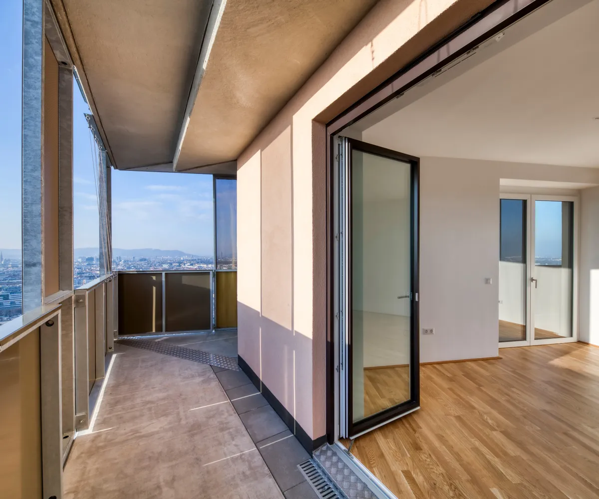 Auch außerhalb der Wohnung sind zahlreiche Features und Extras im Angebot: Ein Fitnessraum für Cardio und Krafttraining, ein Wellnessbereich mit Sauna und Dampfbad, Gemeinschaftsräume mit Küchen, ein Laundry-Room mit Waschmaschinen und Wäschetrocknern, Gemeinschaftsräume, Hobbyräume sowie eine großzügige Terrasse mit Schattigen Plätzen, Kinderspielplatz, und eine Strecken-Laufbahn für sportliche Bewohner. Das alles mit beeindruckendem Ausblick über Wien.