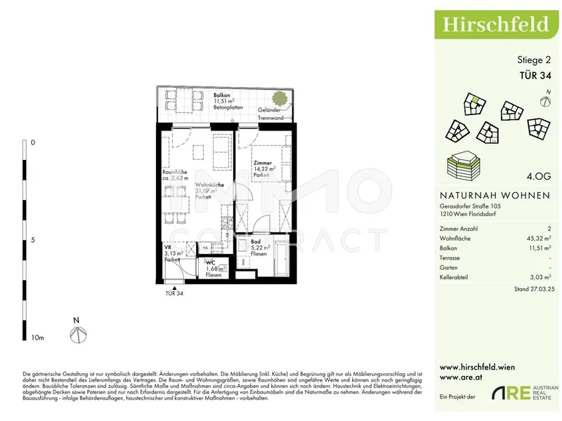 Hirschfeld ist ein beschauliches Viertel am Wiener Stadtrand. Die Metropole im Rücken verheißt jedem Nachhausekommen ein Naturerlebnis und Entspannung. Wer gerne mit den Wiener Linien unterwegs ist, nimmt am besten die Autobuslinie 32A ab Kollarzgasse bis zum U- und S-Bahn-Knotenpunkt Leopoldau. Von hier aus ermöglichen die U1 in Richtung Zentrum sowie die Schnellbahnlinien S1, S2 und S7 eine rasche Verbindung stadtein- und stadtauswärts. Alternativ verläuft die Straßenbahnlinie 31 entlang der Brünner Straße über Floridsdorf direkt bis Schottenring. Autofahrer profitieren von der nahegelegenen A22.