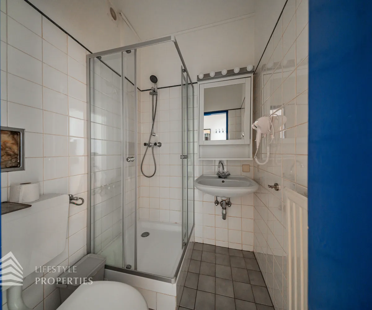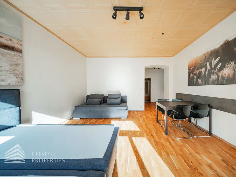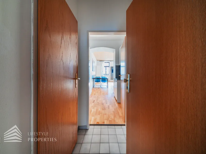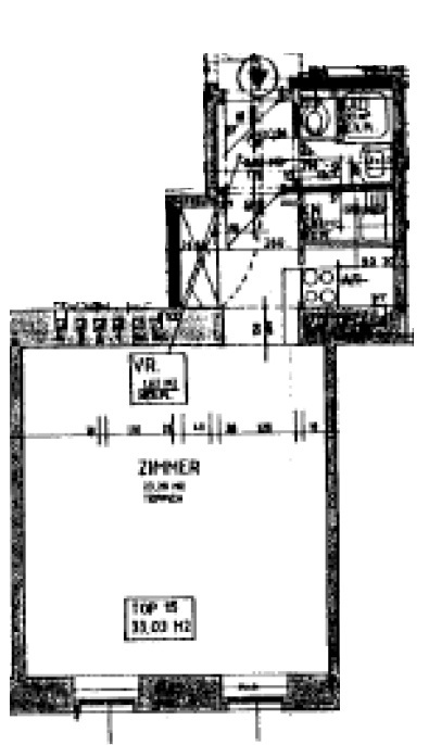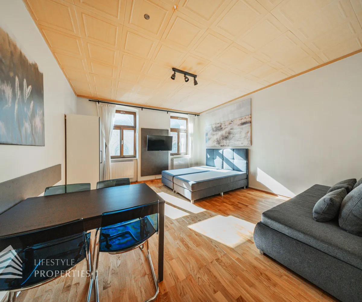 Die Wohnung hat eine Größe von ca. 34 m² und befindet sich im 4. Stock eines Altbaus. Das Haus verfügt über sechs Etagen und wurde im Jahr 1993 sockelsaniert. Sie gliedert sich in einen Vorraum, einen Wohn- Schlafraum mit kleiner Küche, ein Bad mit Dusche und ein separates WC.