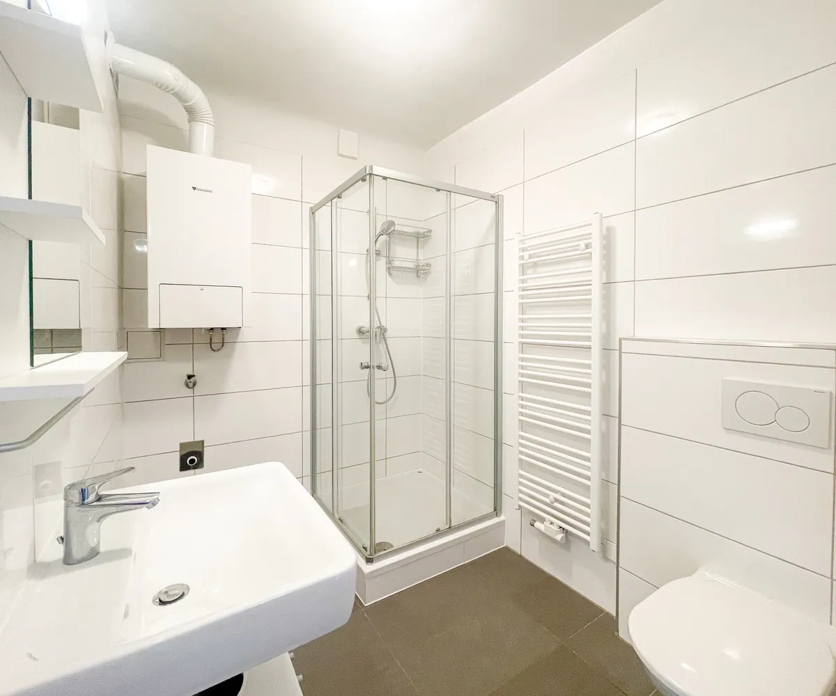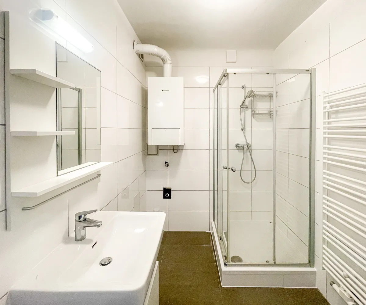 großzügiges, helles Badezimmer mit Dusche, WC, Waschmaschinenanschluss
