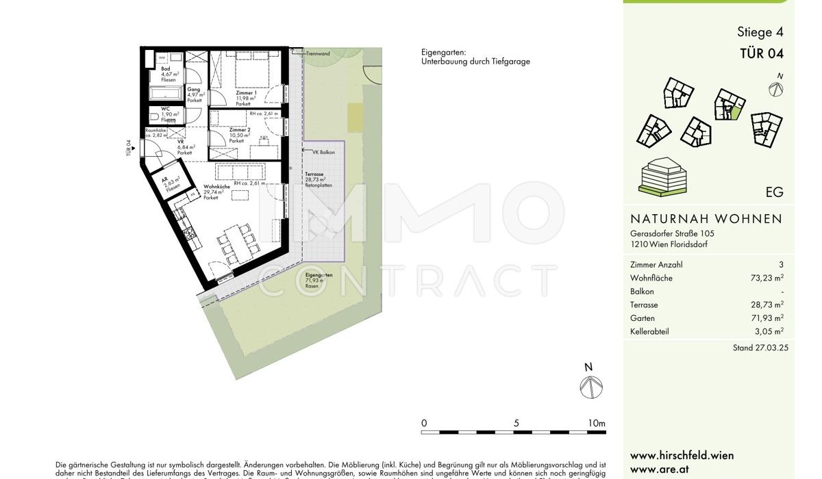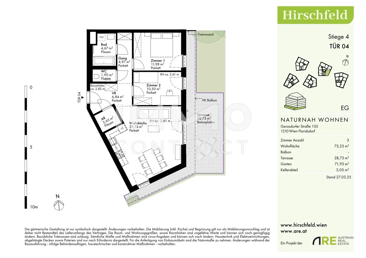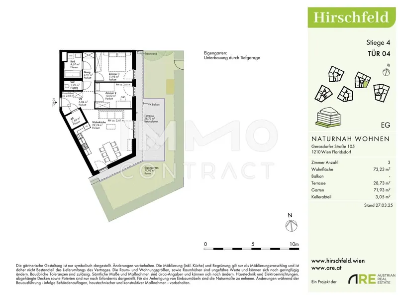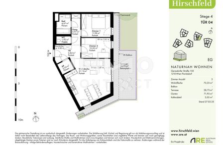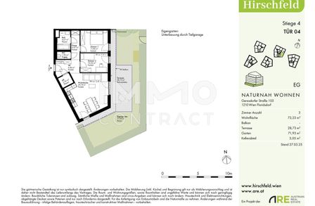 Hirschfeld ist ein beschauliches Viertel am Wiener Stadtrand. Die Metropole im Rücken verheißt jedem Nachhausekommen ein Naturerlebnis und Entspannung. Wer gerne mit den Wiener Linien unterwegs ist, nimmt am besten die Autobuslinie 32A ab Kollarzgasse bis zum U- und S-Bahn-Knotenpunkt Leopoldau. Von hier aus ermöglichen die U1 in Richtung Zentrum sowie die Schnellbahnlinien S1, S2 und S7 eine rasche Verbindung stadtein- und stadtauswärts. Alternativ verläuft die Straßenbahnlinie 31 entlang der Brünner Straße über Floridsdorf direkt bis Schottenring. Autofahrer profitieren von der nahegelegenen A22.