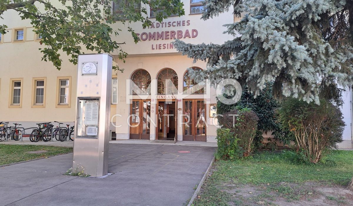 Vis a vis des Liesinger Freibades mit Aussicht auf einen öffentl.Park, der ein Wasserschloss beherbergt