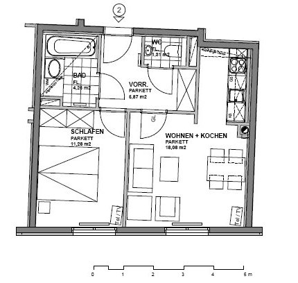 Die Wohnung selbst befindet sich im Erdgeschoss und verfügt über eine Wohnküche, ein Schlafzimmer, ein Badezimmer, ein separates WC sowie einen Vorraum.