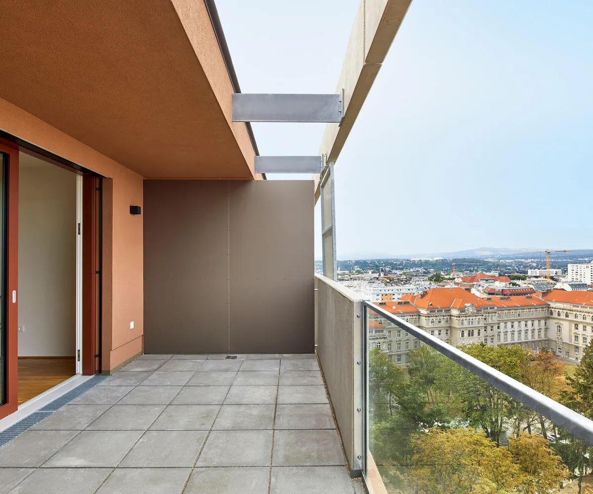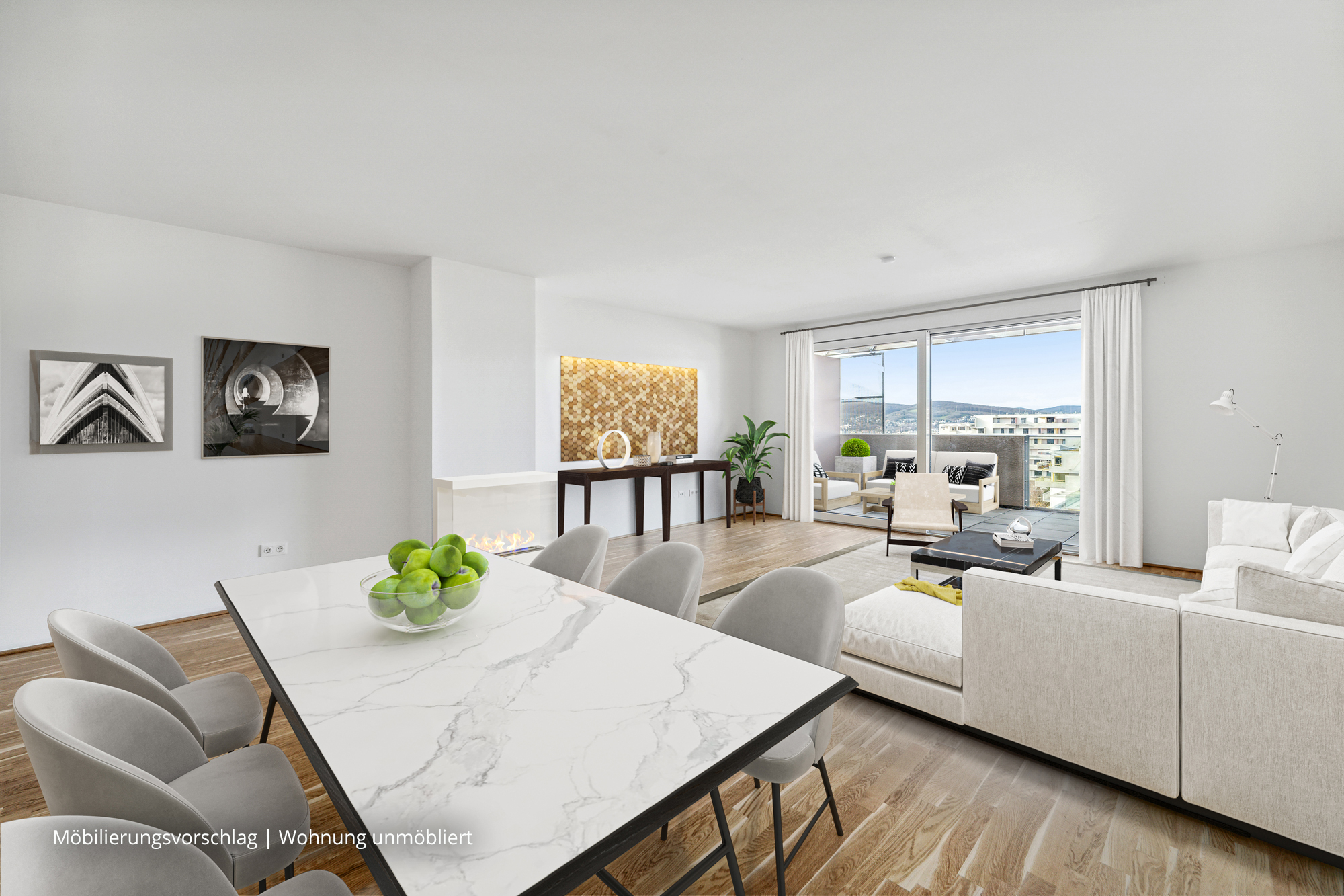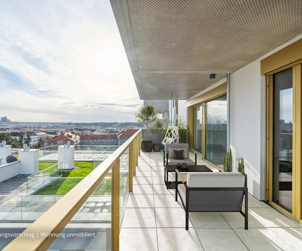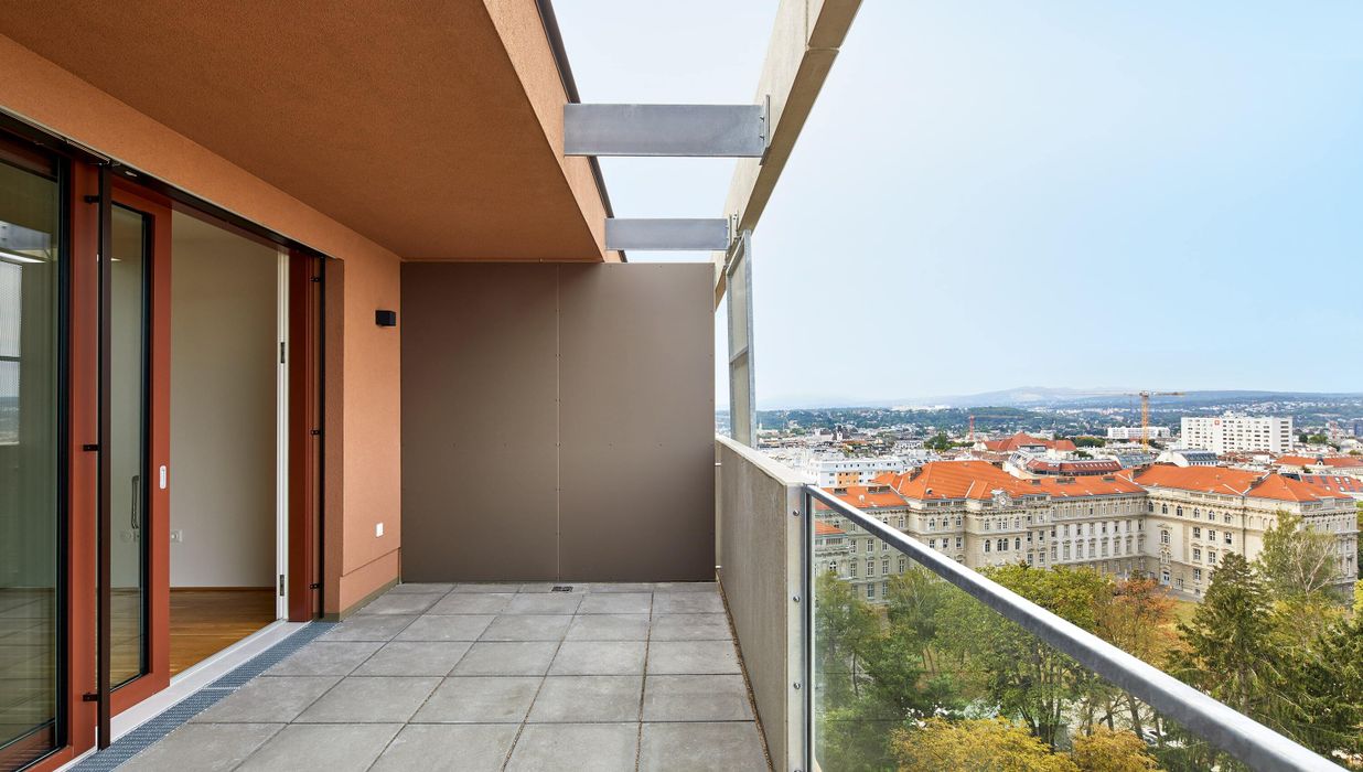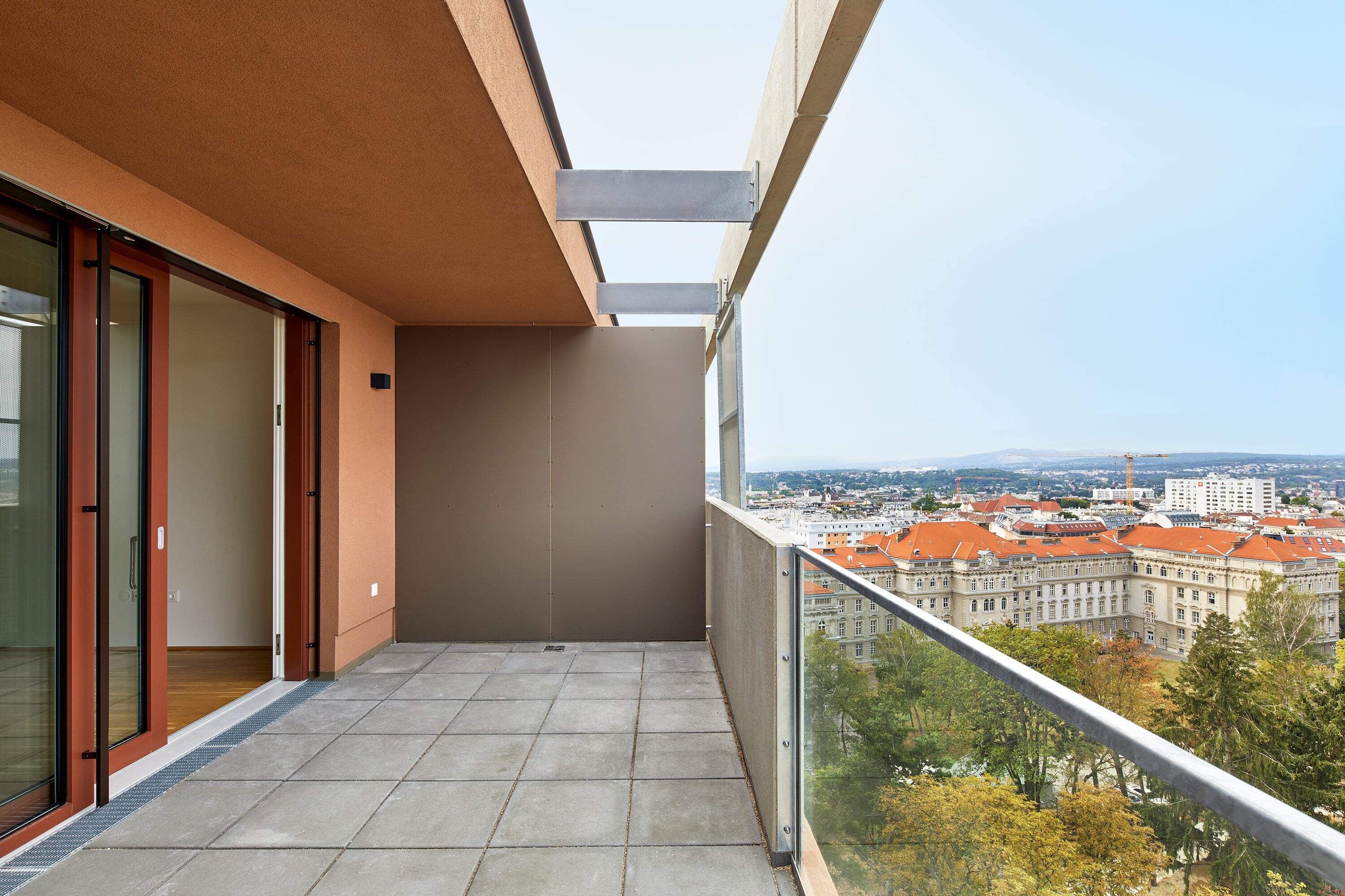 In der 9. Etage von Stiege 2 befindet sich die großzügige 3-Zimmer-Eigentumswohnung TOP 78 mit ca. 115 m² Wohnnutzfläche, inklusive zwei Loggien mit gesamt ca. 21 m² auf beiden Seiten der Wohnung. Der durchgesteckte Grundriss ermöglicht Morgensonne und Abendlicht, während die offen gestaltete Wohnküche mit fast 40 m² das kommunikative Zentrum der Wohnung bildet.