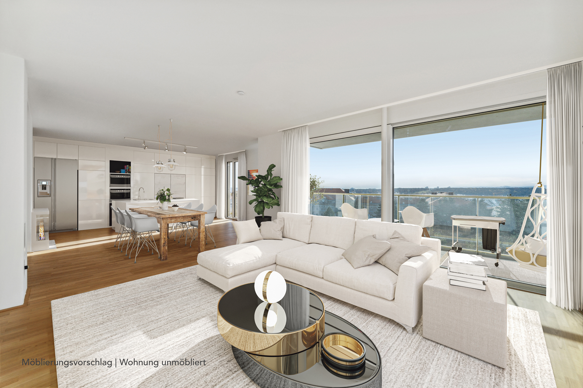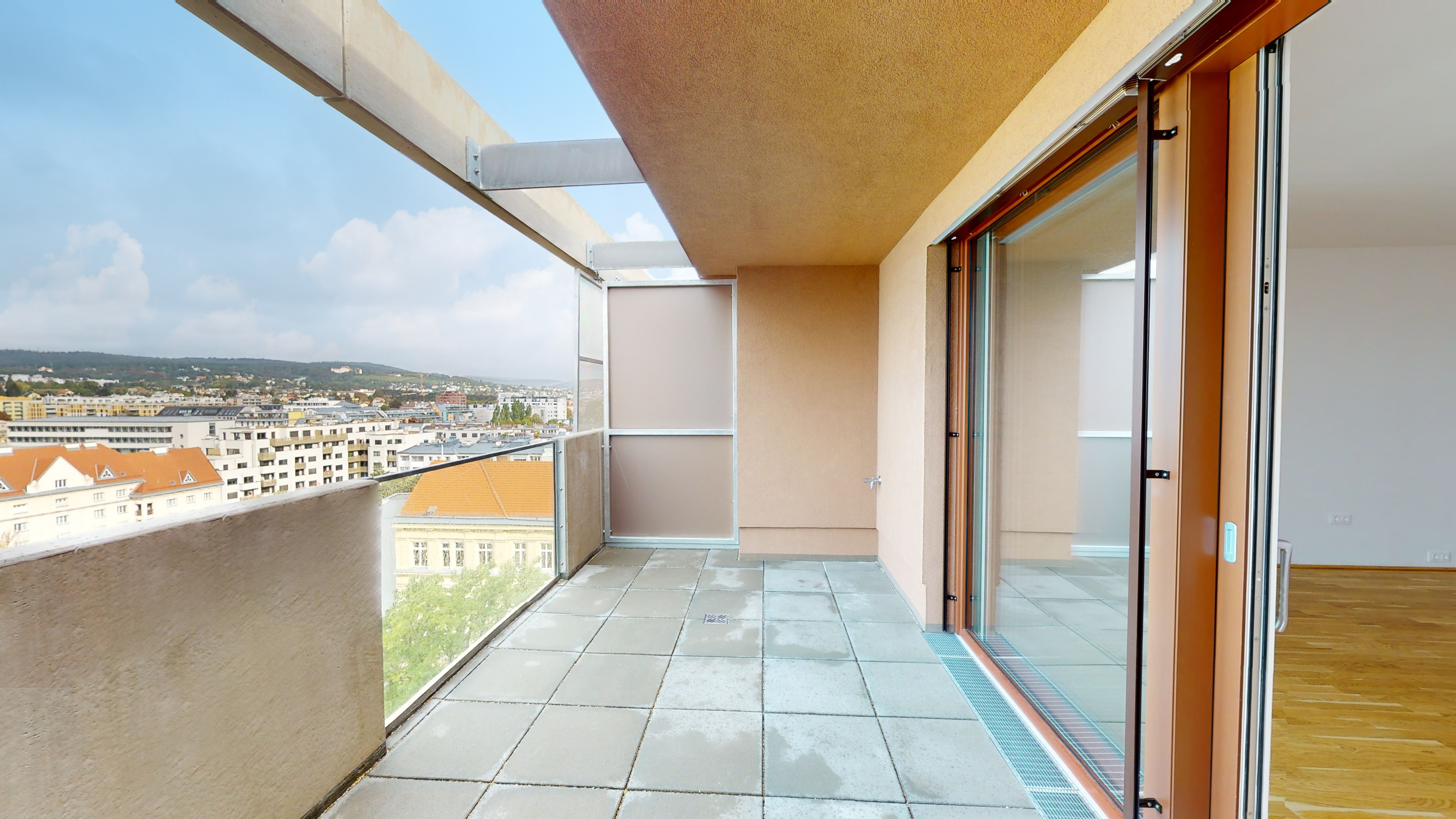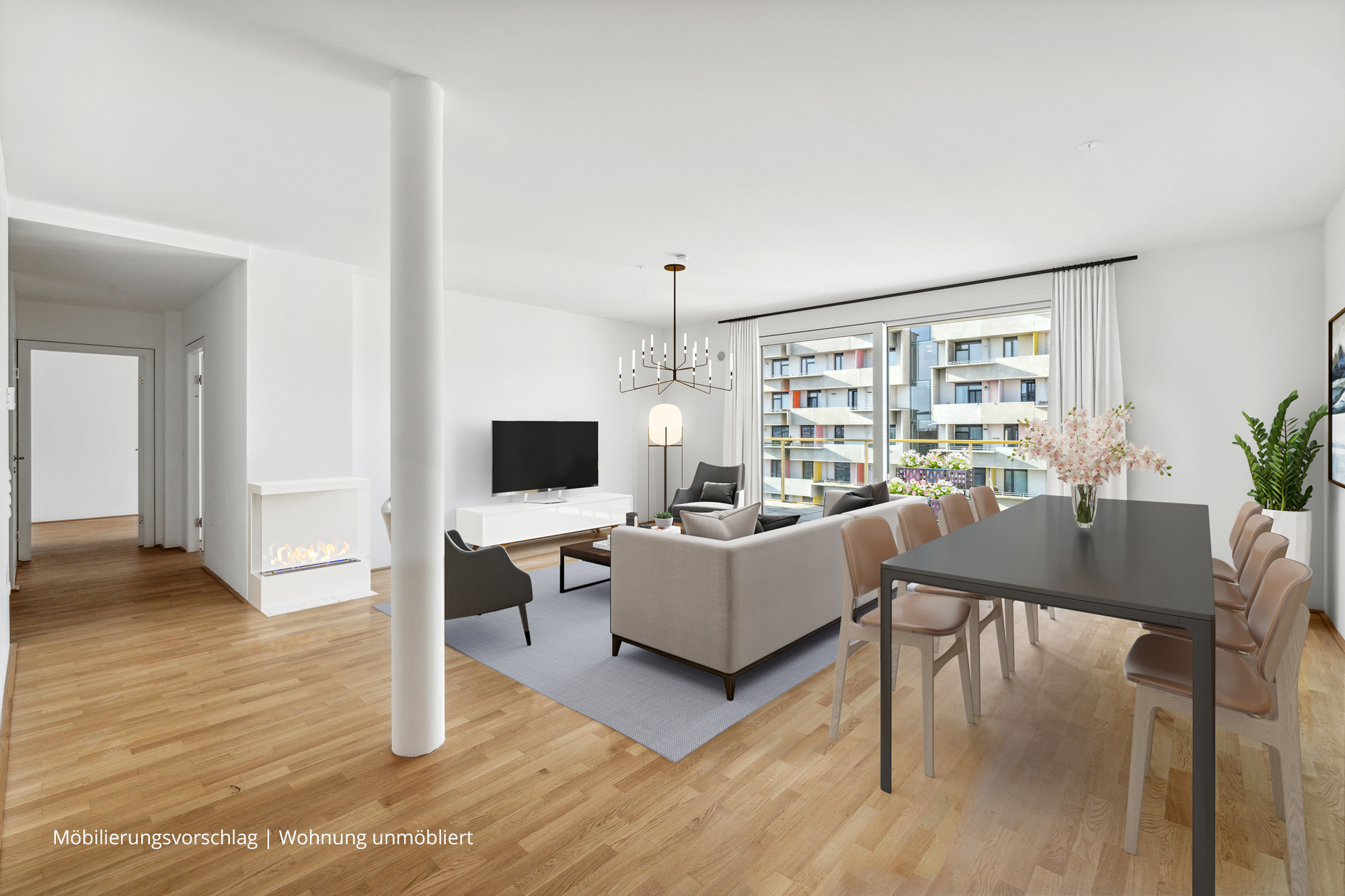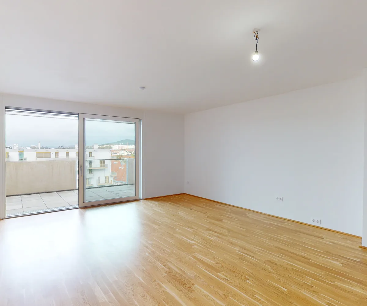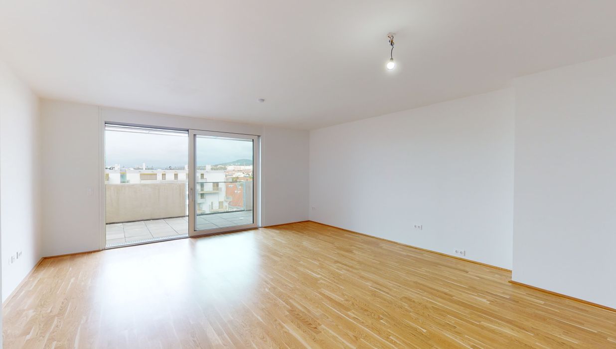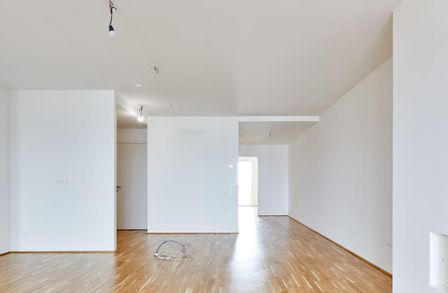 In der 9. Etage von Stiege 2 befindet sich die großzügige 3-Zimmer-Eigentumswohnung TOP 78 mit ca. 115 m² Wohnnutzfläche, inklusive zwei Loggien mit gesamt ca. 21 m² auf beiden Seiten der Wohnung. Der durchgesteckte Grundriss ermöglicht Morgensonne und Abendlicht, während die offen gestaltete Wohnküche mit fast 40 m² das kommunikative Zentrum der Wohnung bildet.