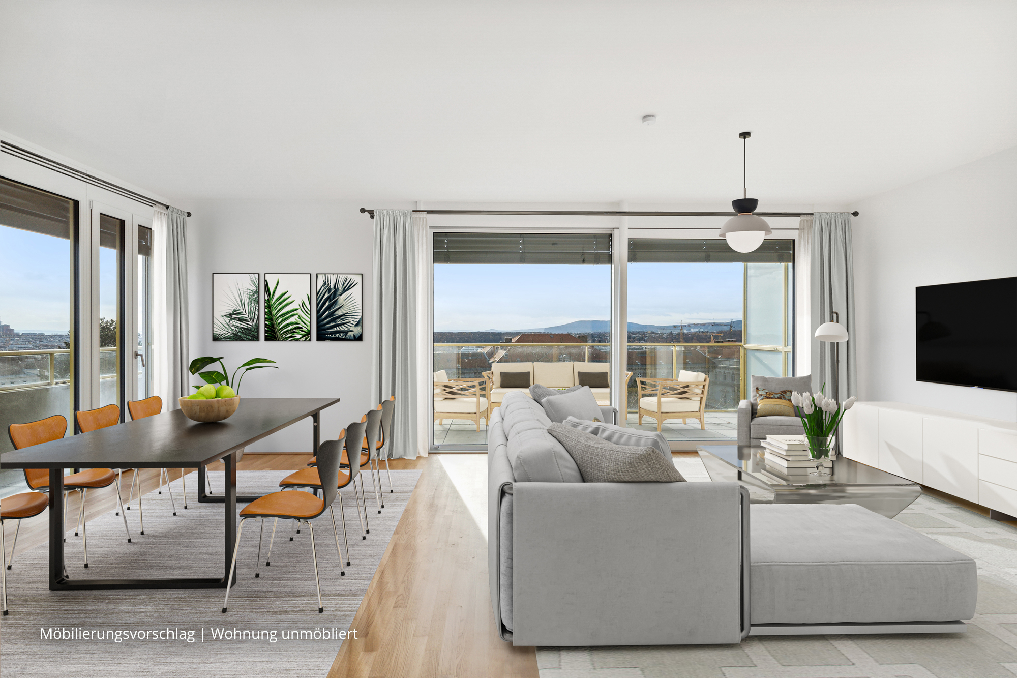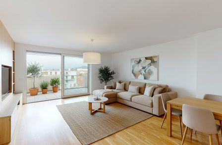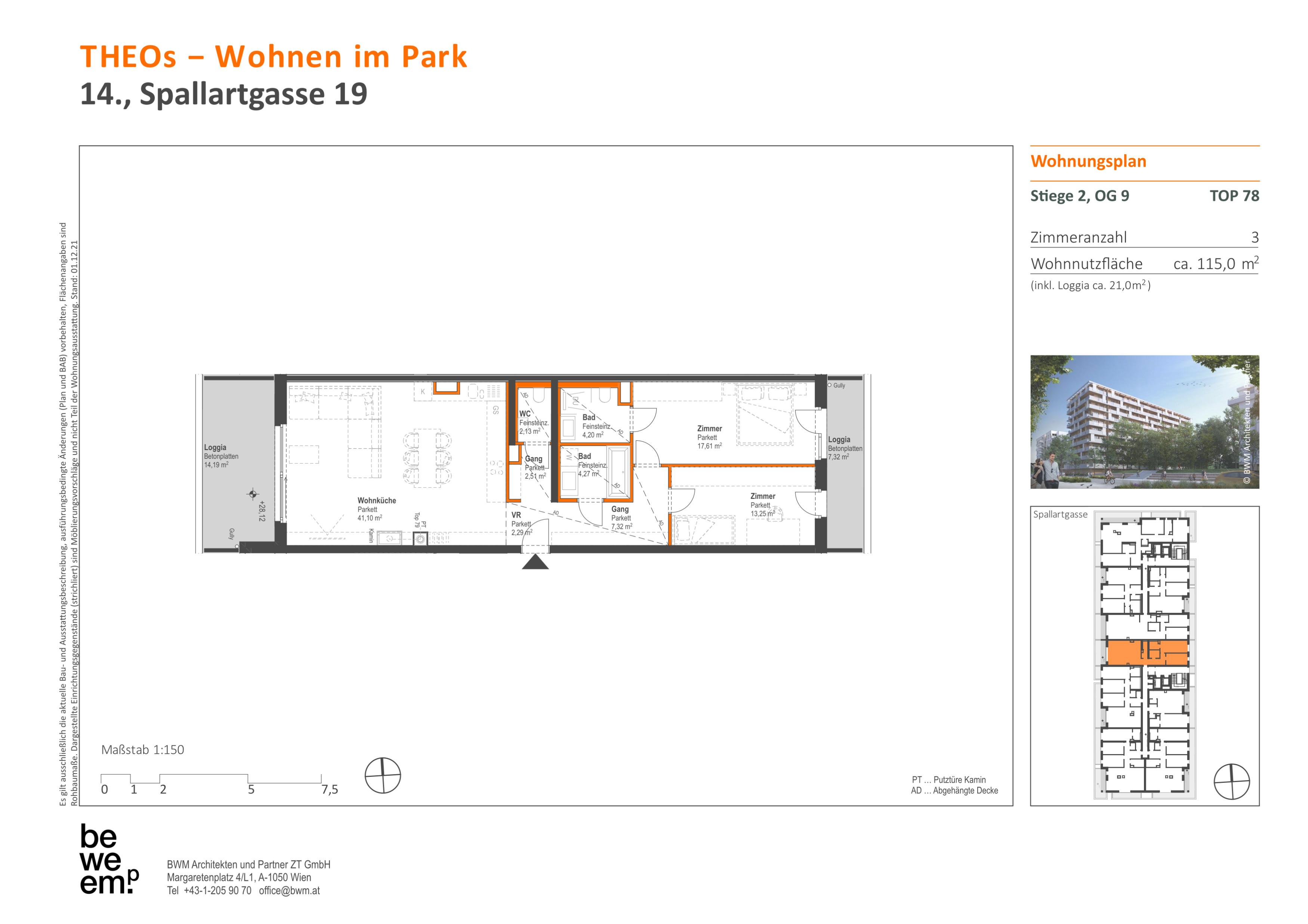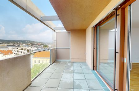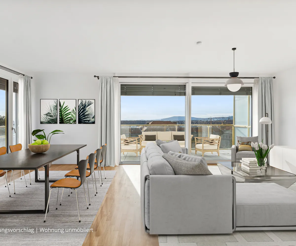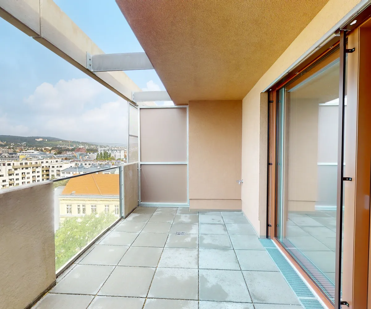 In der 9. Etage von Stiege 2 befindet sich die großzügige 3-Zimmer-Eigentumswohnung TOP 78 mit ca. 115 m² Wohnnutzfläche, inklusive zwei Loggien mit gesamt ca. 21 m² auf beiden Seiten der Wohnung. Der durchgesteckte Grundriss ermöglicht Morgensonne und Abendlicht, während die offen gestaltete Wohnküche mit fast 40 m² das kommunikative Zentrum der Wohnung bildet.