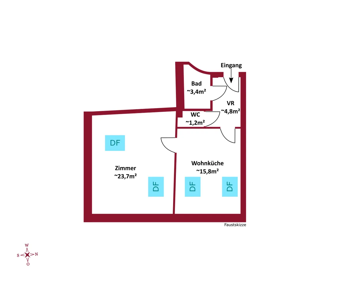 Die Wohnung besteht aus 2 Zimmer, mit knapp 48,92 m² Wohnfläche und gliedert sich in folgende, funktionelle Raumaufteilung: