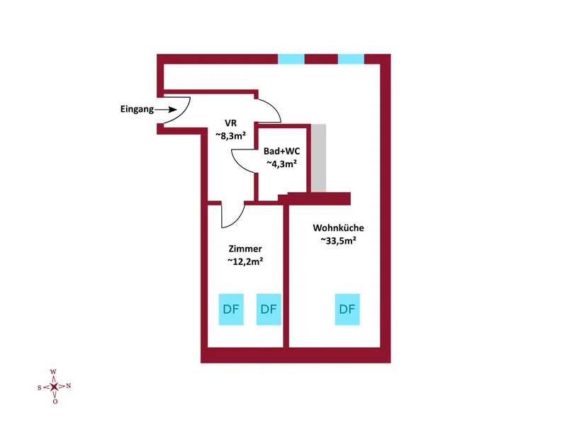 Die Wohnung besteht aus 2 Zimmer, mit knapp 61,42 m² Wohnfläche und gliedert sich in folgende, funktionelle Raumaufteilung: