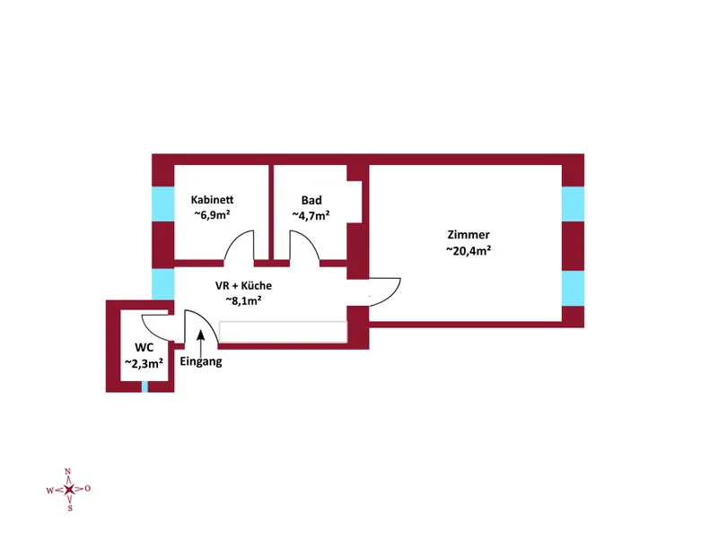 Die Wohnung besteht aus 2 Zimmer, mit knapp 42 m² Wohnfläche und gliedert sich in folgende, funktionelle Raumaufteilung: