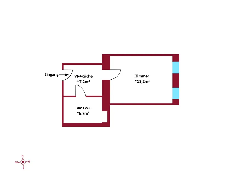 Die Wohnung besteht aus 1 Zimmer, mit knapp 32 m² Wohnfläche und gliedert sich in folgende, funktionelle Raumaufteilung: