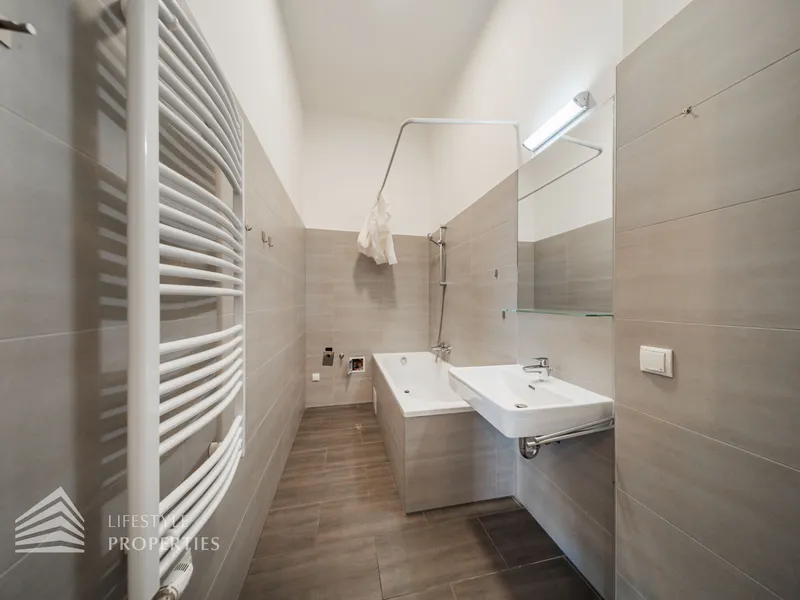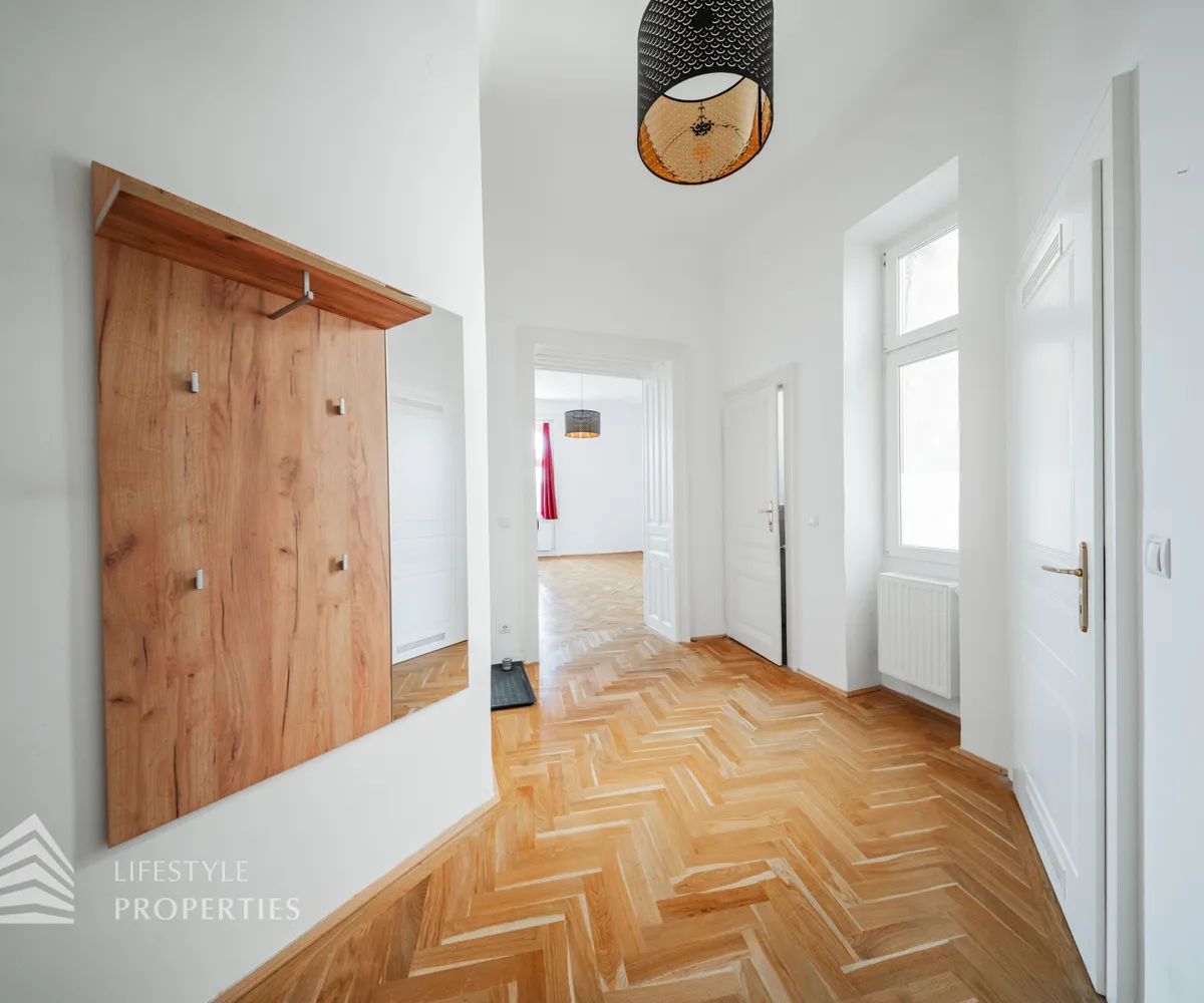 Sie betreten die Wohnung und befinden sich im Vorraum, gerade durch gelangen Sie in das geräumige Wohnzimmer. Das Schlafzimmer ist über den Salon begehbar. Das Bad ist mit einer Badewanne, einem Handwaschbecken, einem Waschmaschinenanschluss und einem Handtuchtrockner ausgestattet. Die Küche und das separate WC sind ebenfalls vom Vorraum erreichbar. Die Wohnräume sind mit schönem Parkett ausgestattet und die Nassräume sind verfliest.