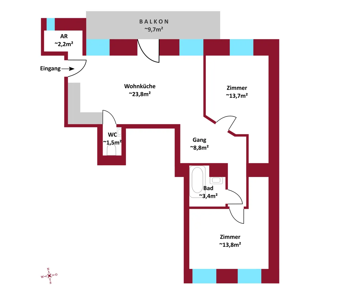 Aufteilung der insgesamt ca. 76,86 m² großen 3-Zimmer Wohnung: