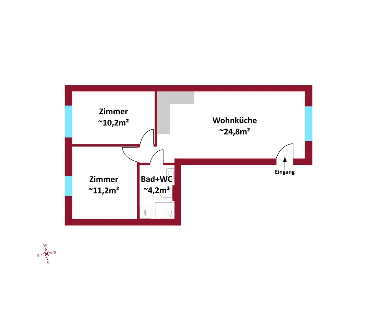 Aufteilung der insgesamt ca. 50,39 m² großen 3-Zimmer Wohnung: