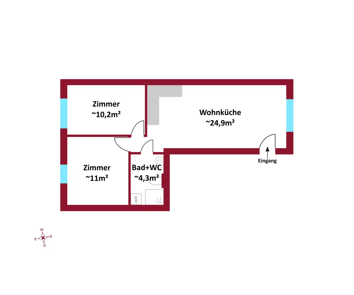 Aufteilung der insgesamt ca. 50,44 m² großen 3-Zimmer Wohnung: