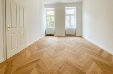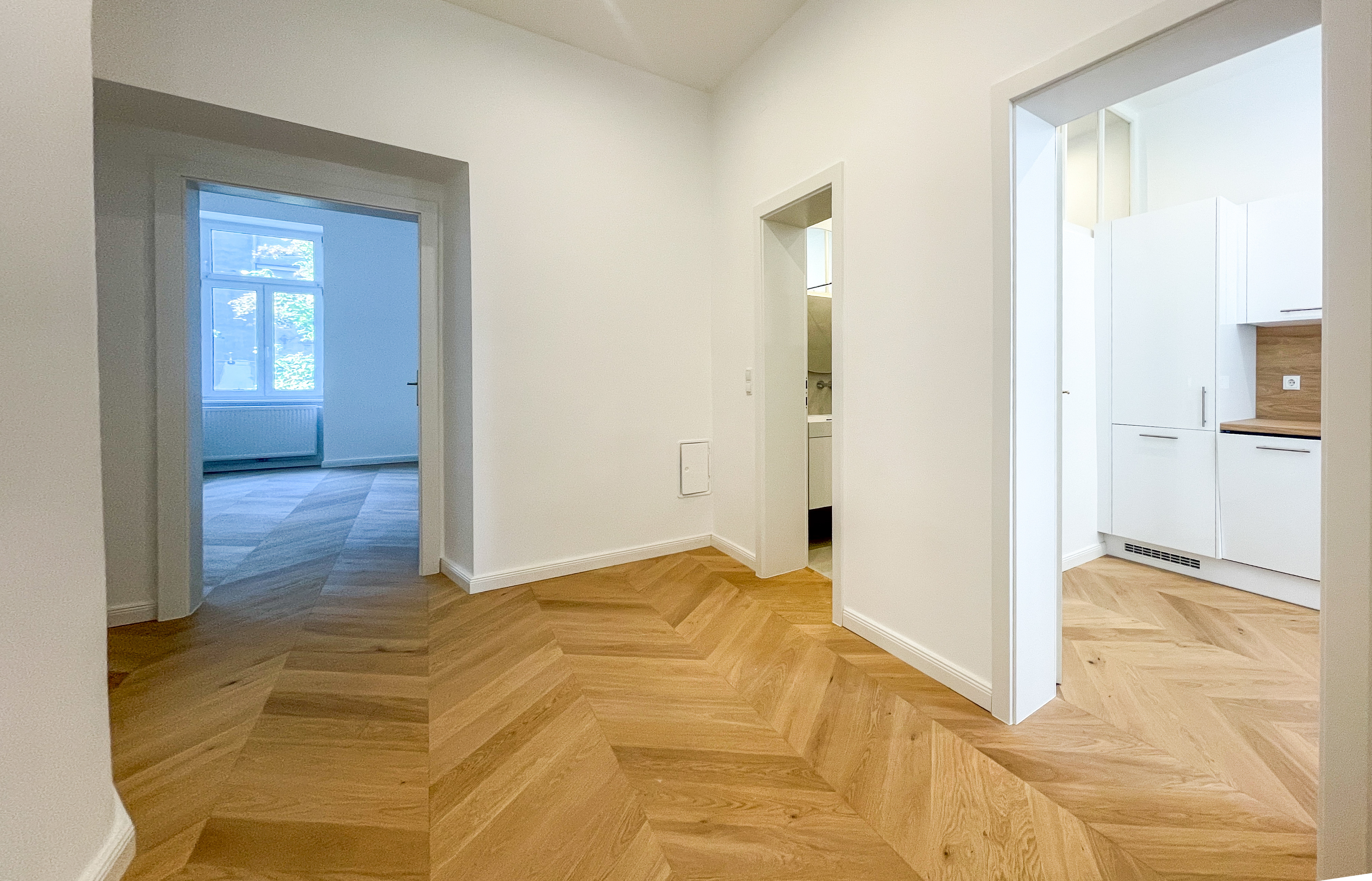 Die Wohnung überzeugt durch einen durchdachten Grundriss und liebevolle Details, wie den neuen Fischgrätparkettboden, der für eine angenehme Wohnatmosphäre im klassischen Altbaustil sorgt. In der separaten, ebenfalls neu ausgestatteten Küche, wurde bereits ein kleiner Essbereich vorgesehen. Das moderne Badezimmer mit großer, ebenerdiger Dusche, einem beleuchteten Spiegel sowie hochwertigen Armaturen ist, wie auch das separate WC, über den Vorraum begehbar.