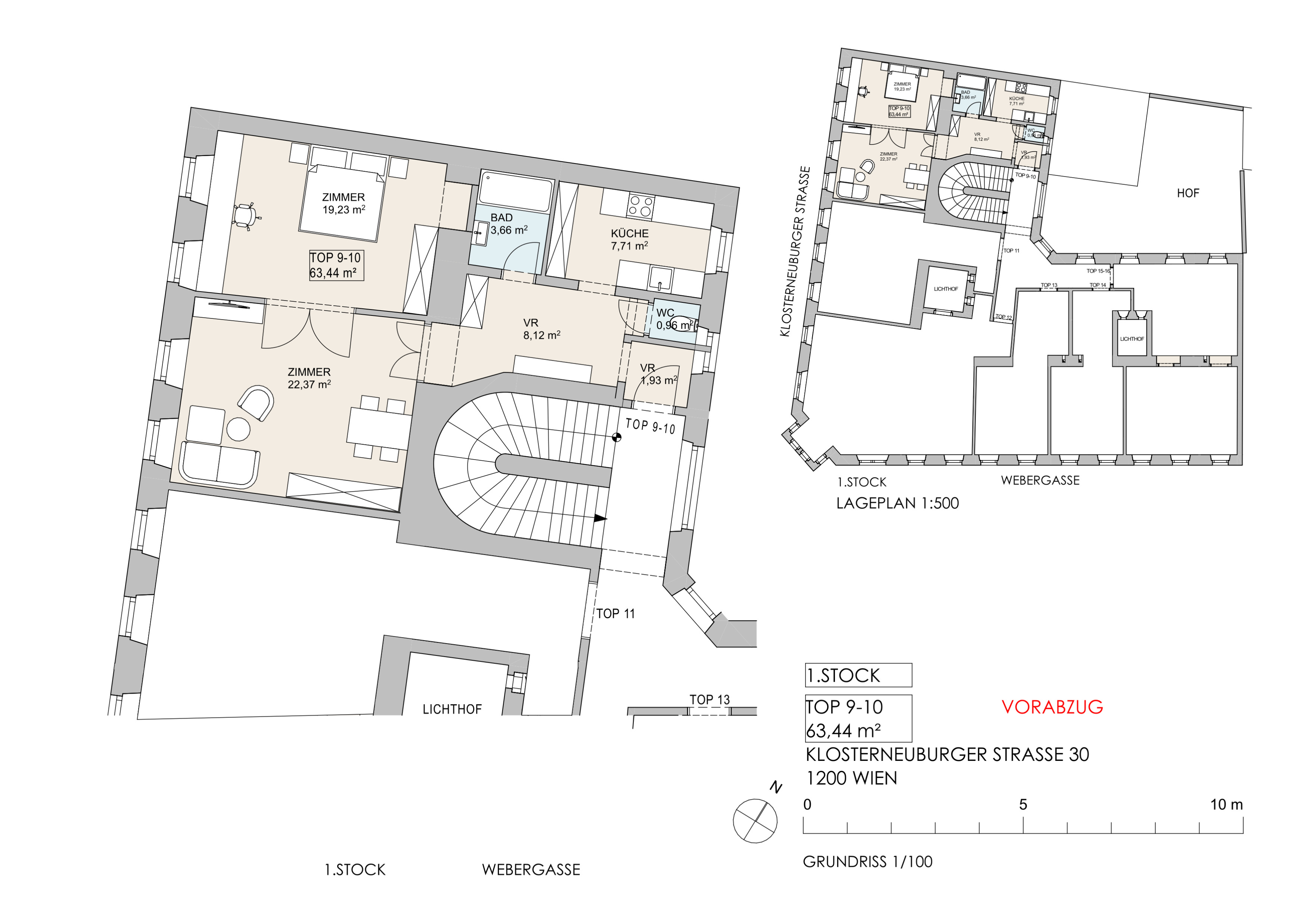 Zum Verkauf steht eine sanierte 2-Zimmer-Wohnung im 1. Obergeschoß eines Altbaus aus dem Jahr 1900. Die Liegenschaft befindet sich in der Webergasse 19, an der Ecke zur Klosterneuburger Straße, nur wenige Gehminuten vom beliebten Augarten entfernt.