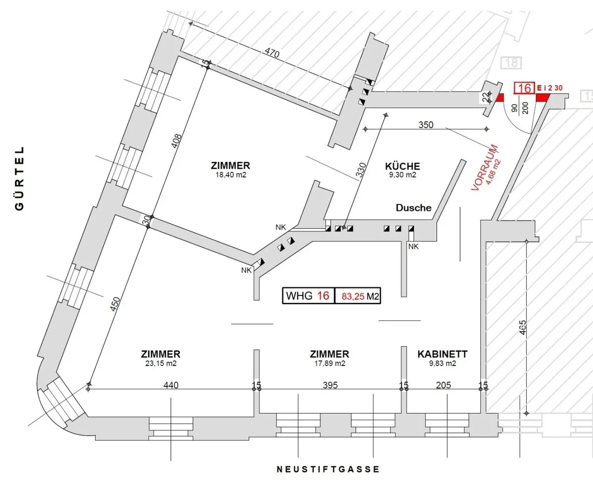 Zum Verkauf gelangt eine sanierungsbedürftige 4-Zimmer-Eigentumswohnung direkt auf der Neustiftgasse / Ecke Lerchenfelder Gürtel in einem sehr schön sanierten Stilaltbauhaus in Wien Neubau. Die räumliche Aufteilung gestaltet