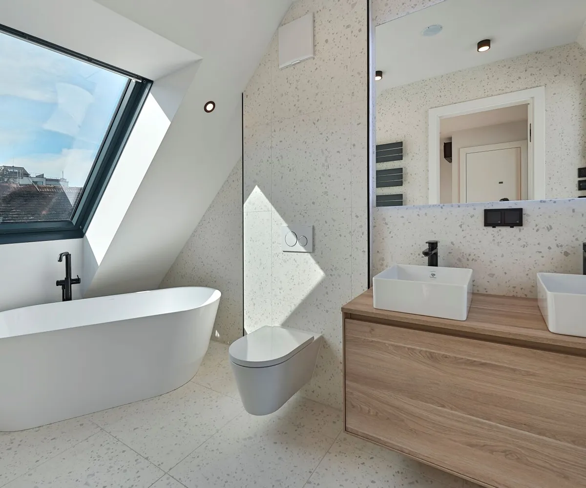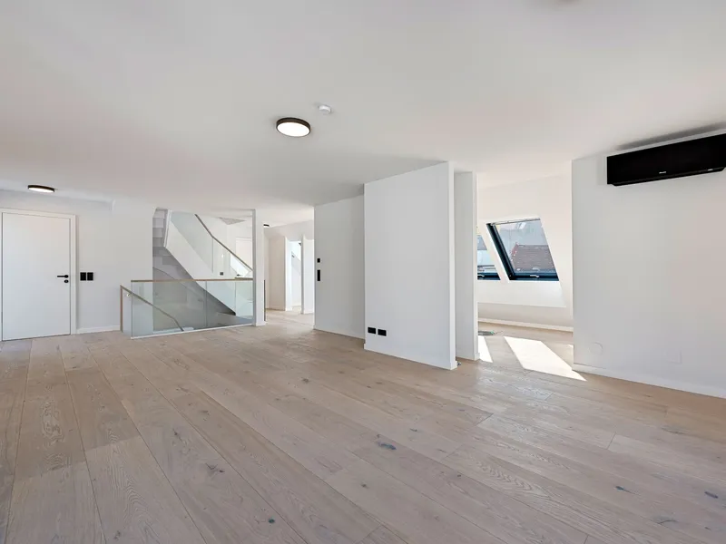 Die Dachwohnungen (drei Einheiten im 1. Dachgeschoß und das Penthouse im 2. Dachgeschoß) setzen dem Projekt die Krone auf. Großflächige Fensterfronten durchfluten die Wohnräume zu jeder Tageszeit mit natürlichem Licht.