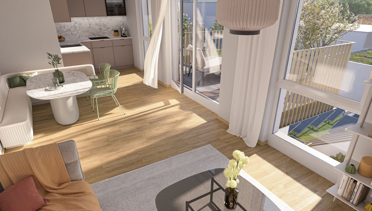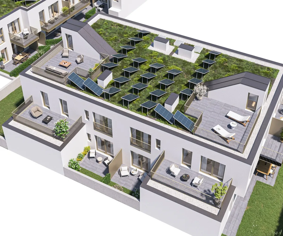 Die sorgfältig geplanten Eigentumswohnungen und Townhouses bieten mit ihren vielfältigen Grundrissen und Wohnungsgrößen für jede Lebensphase die ideale Wohnlösung. Ein behagliches Wohnambiente erzeugen die edlen Eichenparkettböden sowie die hochwertige Sanitärausstattung in den Bädern. Die Raumtemperatur lässt sich bequem über die Fußbodenheizung, die durch Fernwärme betrieben wird, sowie über die elektrisch bedienbaren Raffstores oder Rollläden regulieren. In den Dachgeschosswohnungen sorgen zusätzlich installierte Klimaanlagen dafür, dass es auch im Sommer angenehm kühl bleibt. Jede Wohneinheit verfügt über eine eigene private Freifläche, die die Wohnräume nach außen erweitert und einen idealen Rückzugsort für Erholung und Entspannung bietet.
