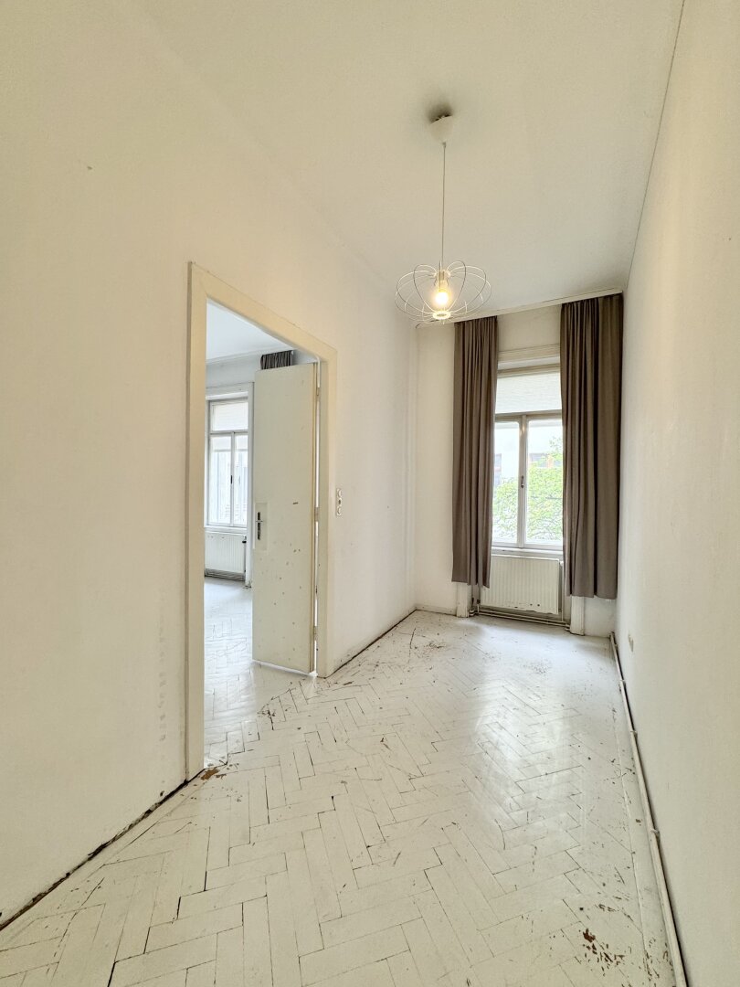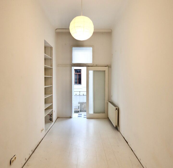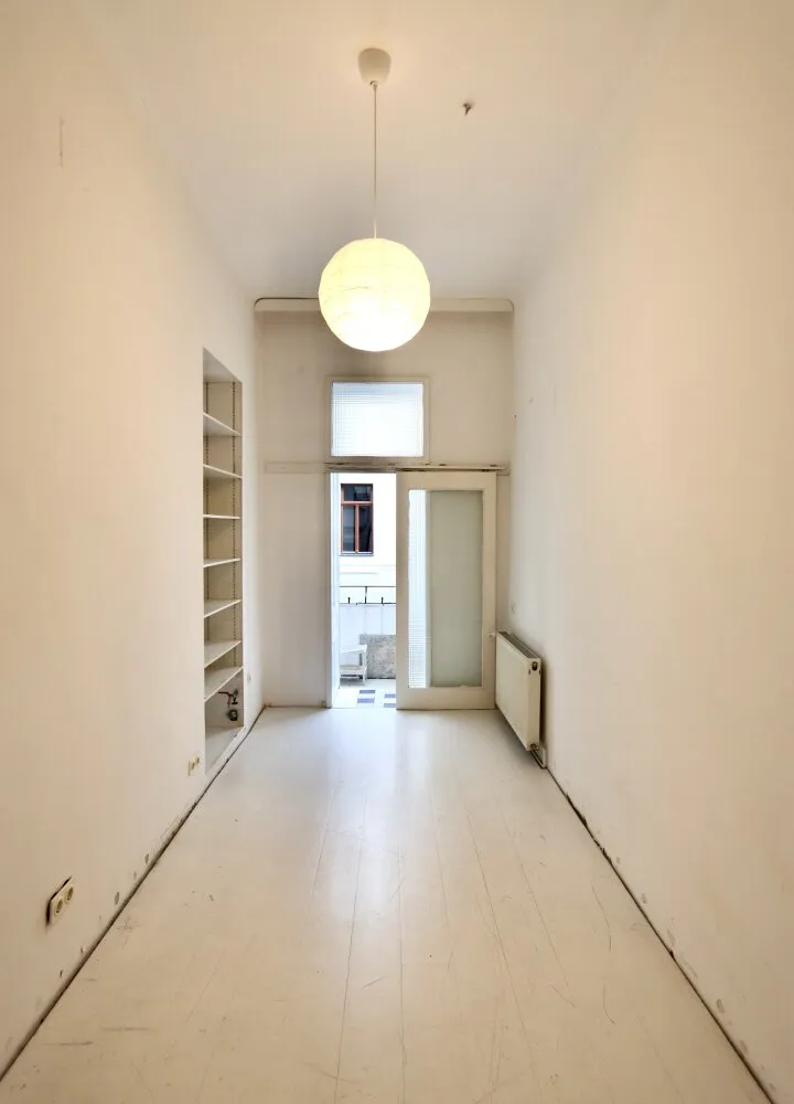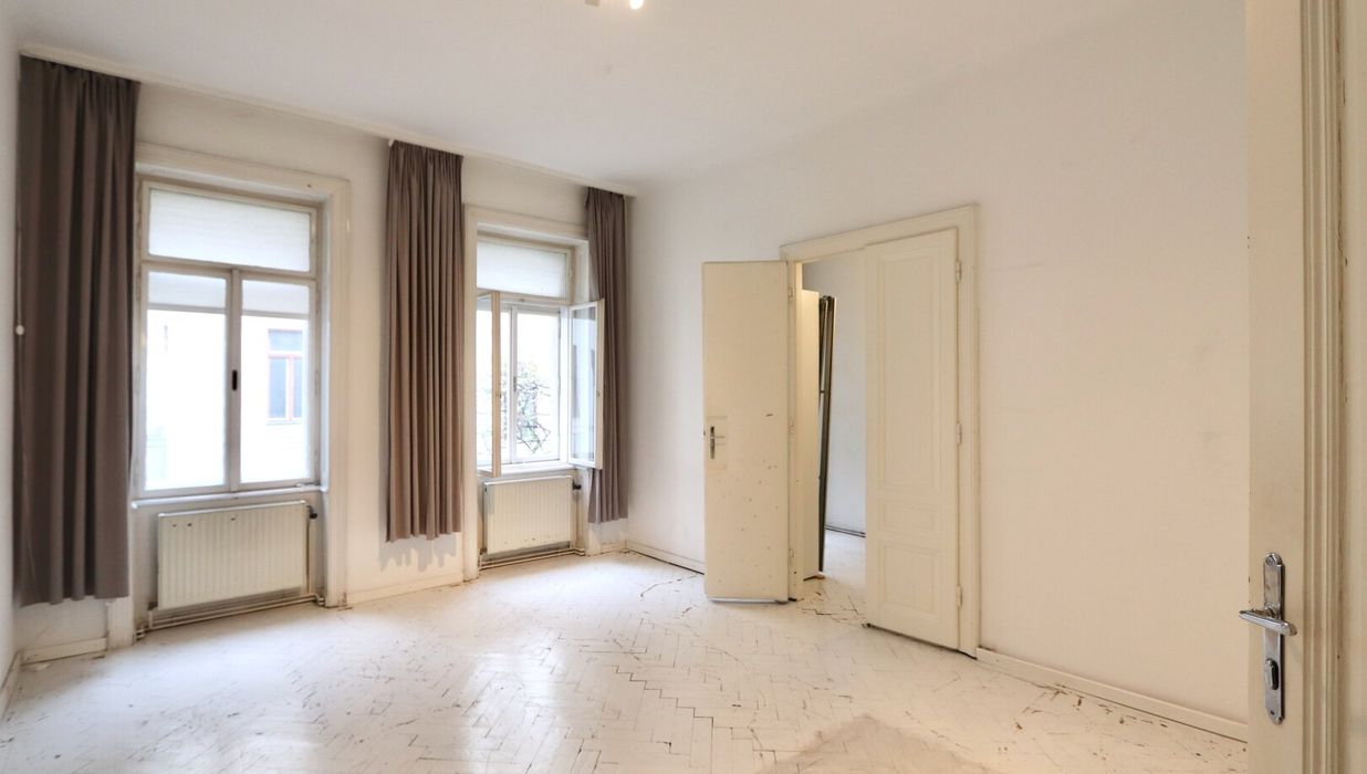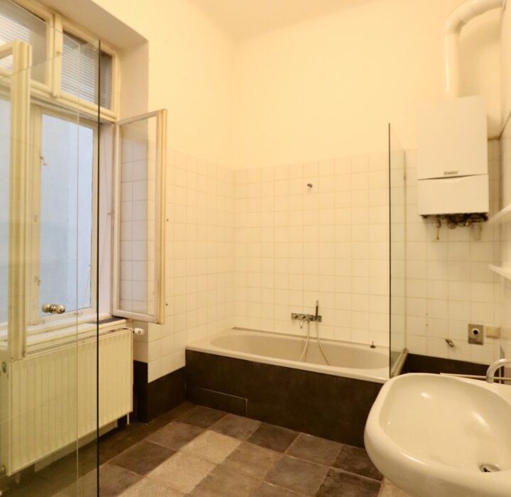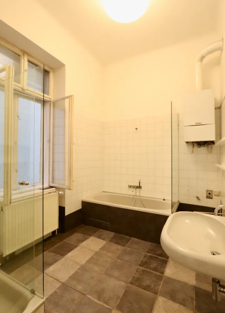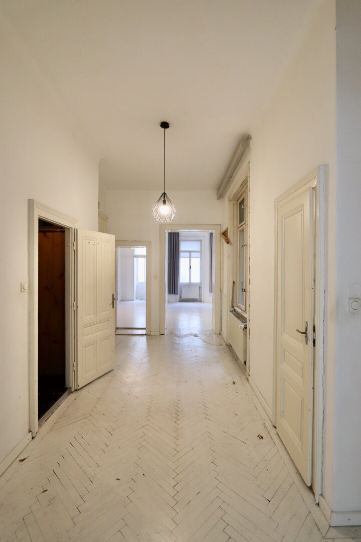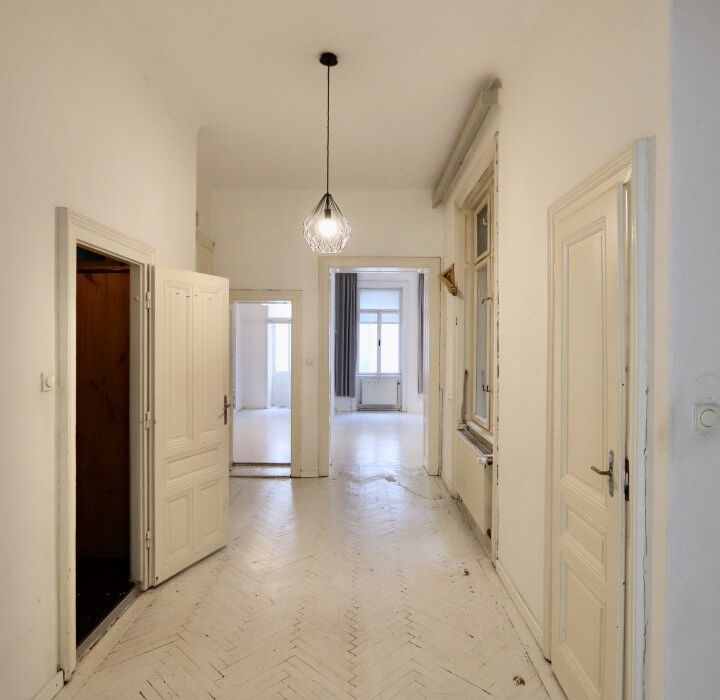 Der sanierungsbedürftige 4-Zimmer-Altbau mit ca. 124 qm Wohnfläche befindet sich im 1. Stock (entspricht der 2. Etage, da sich ein Mezzanin dazwischen befindet) und ist in den Innenhof sowie auf die Bandgasse ausgerichtet.