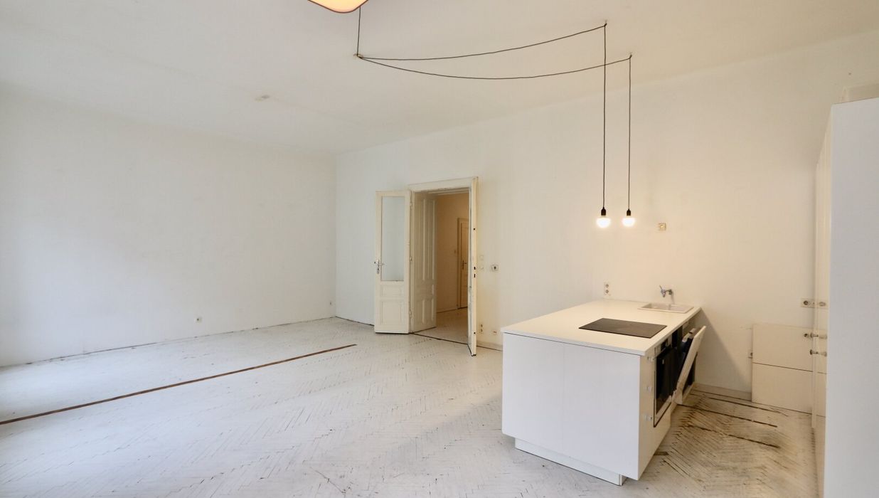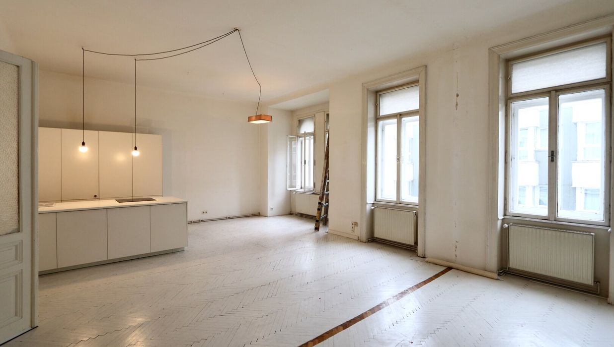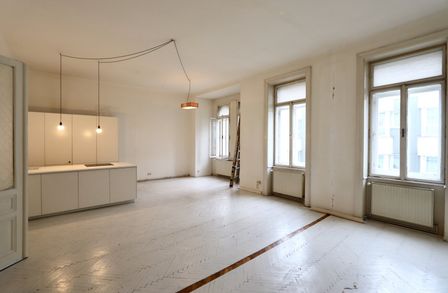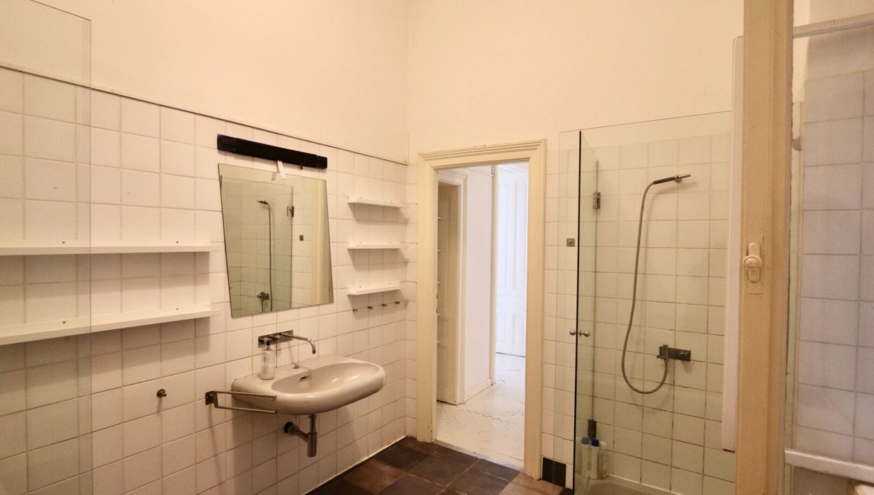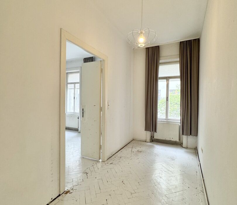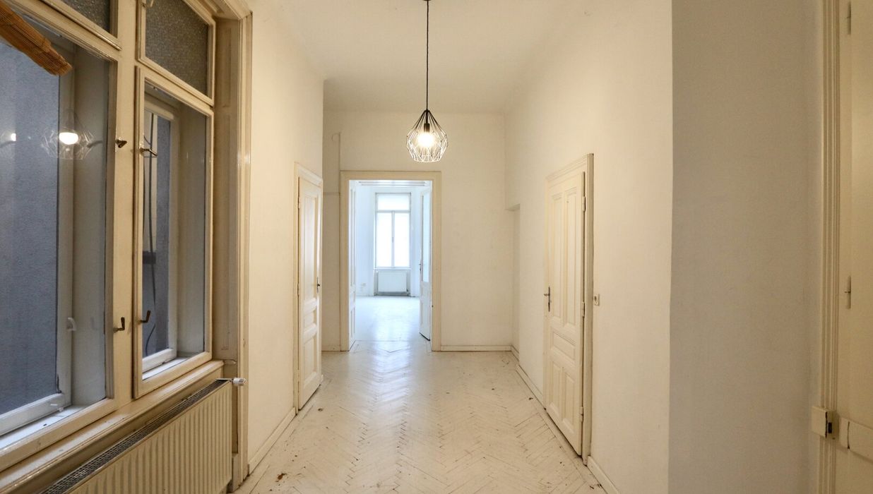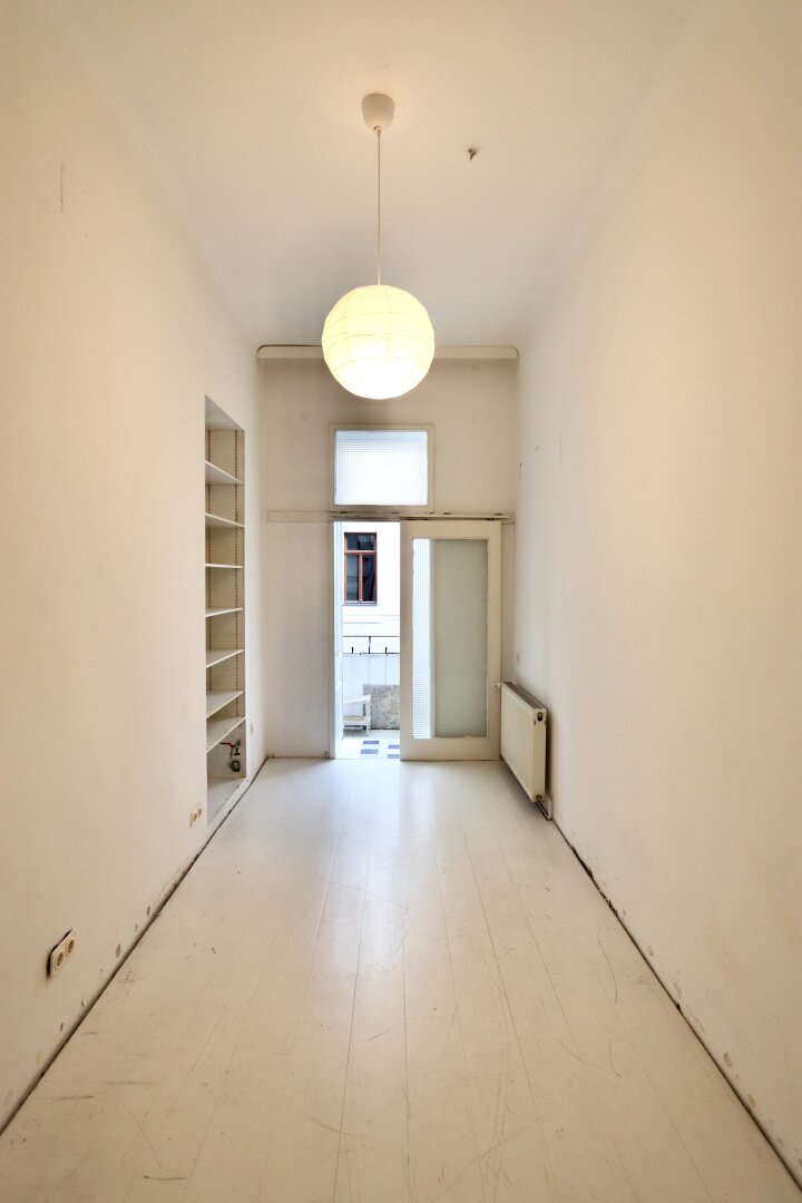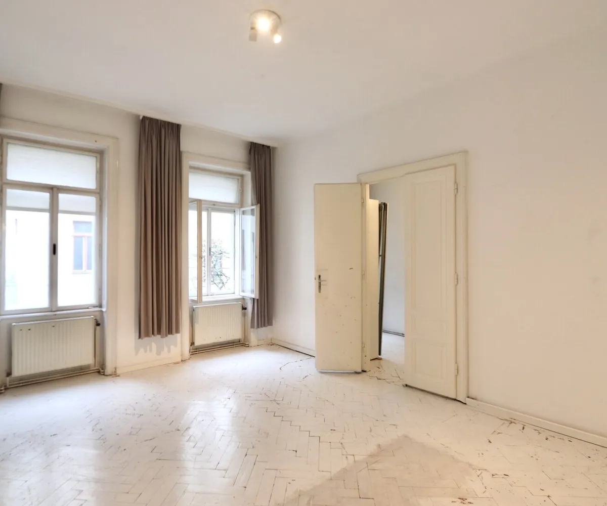 Der sanierungsbedürftige 4-Zimmer-Altbau mit ca. 124 qm Wohnfläche befindet sich im 1. Stock (entspricht der 2. Etage, da sich ein Mezzanin dazwischen befindet) und ist in den Innenhof sowie auf die Bandgasse ausgerichtet.
