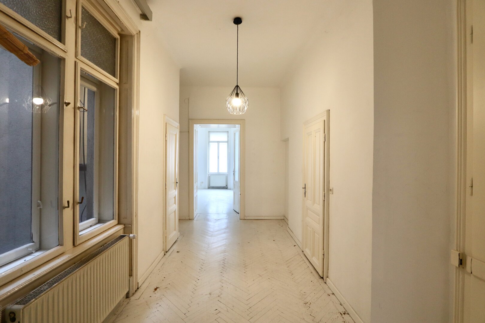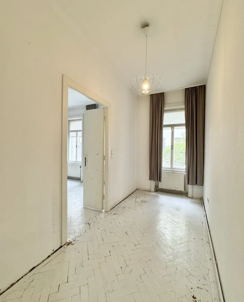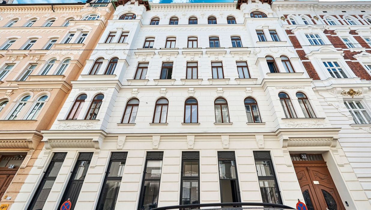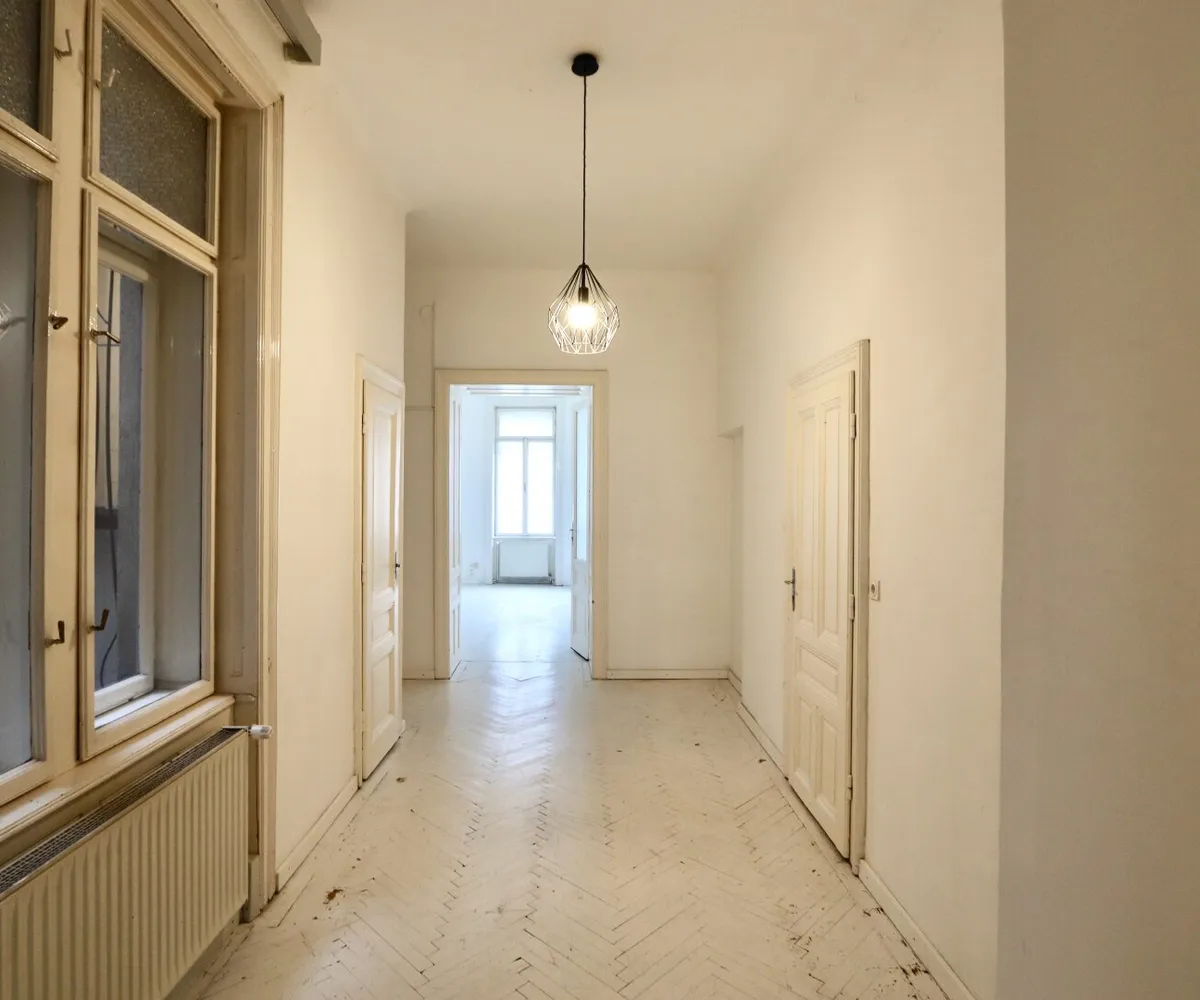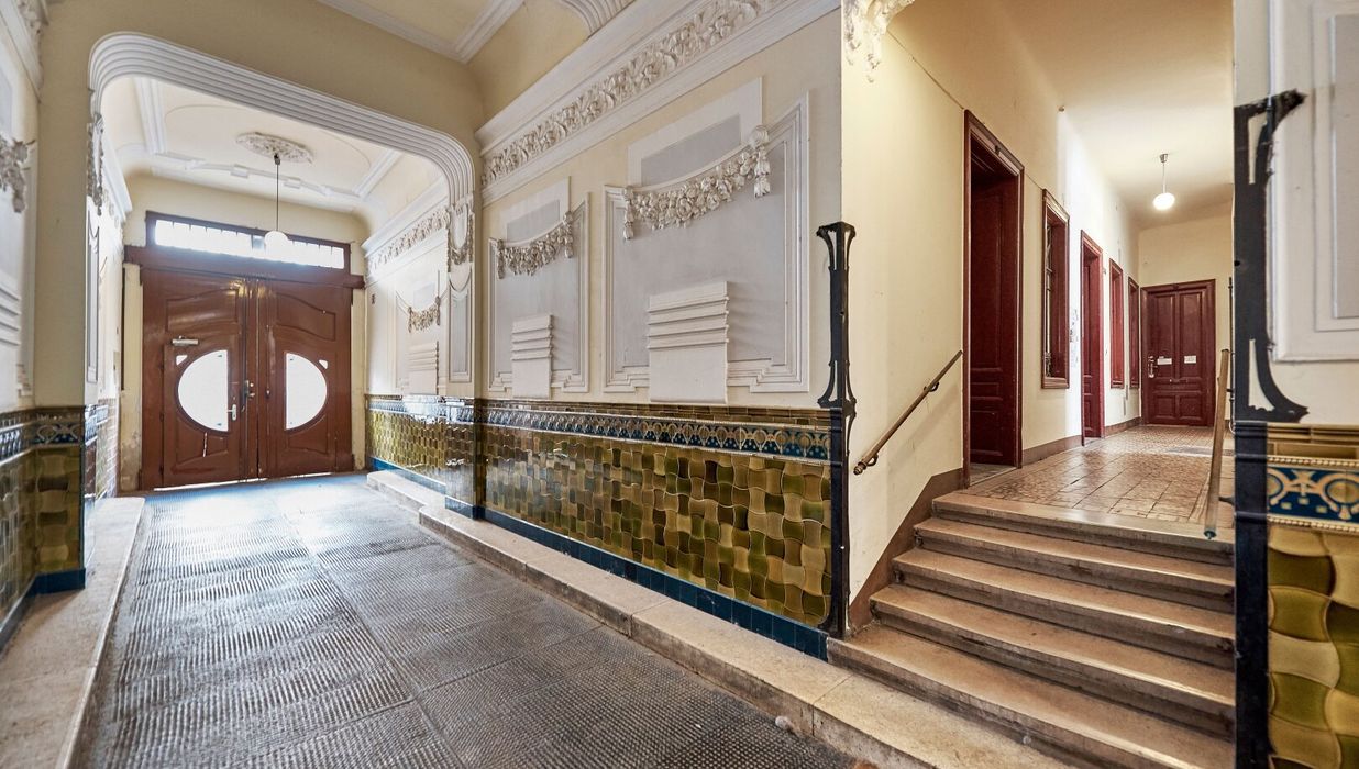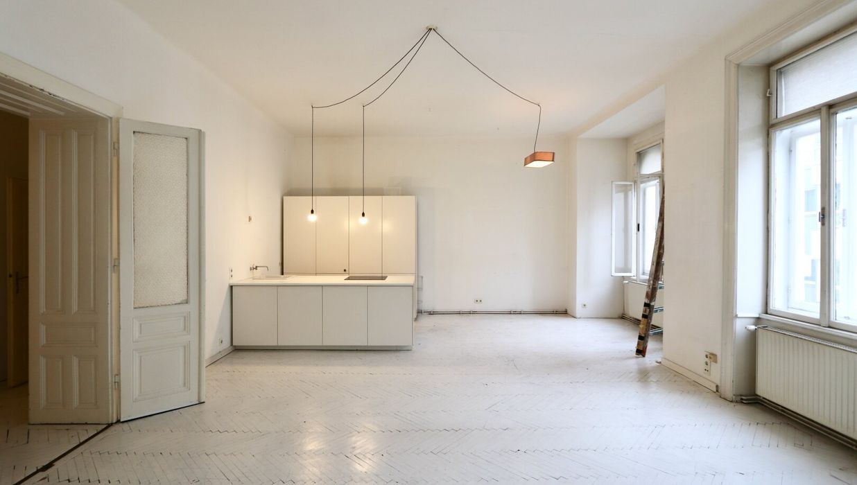 Der sanierungsbedürftige 4-Zimmer-Altbau mit ca. 124 qm Wohnfläche befindet sich im 1. Stock (entspricht der 2. Etage, da sich ein Mezzanin dazwischen befindet) und ist in den Innenhof sowie auf die Bandgasse ausgerichtet.