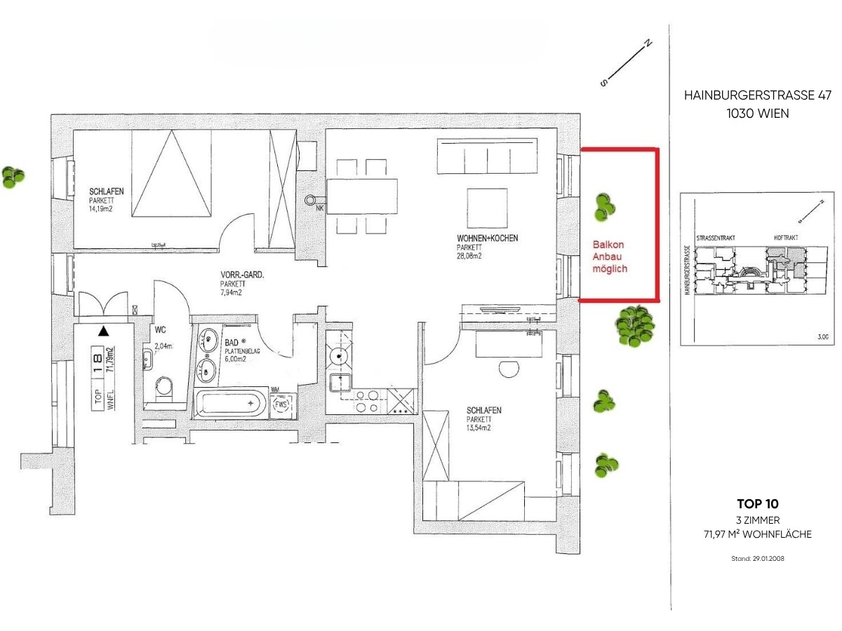 TOP 10 im 1. Liftstock verfügt über 3-Zimmer mit ca. 71 qm Wohnfläche und liegt im Hoftrakt in vollkommener Innenhof-Ruhelage , von grünem Baumbestand umgeben: