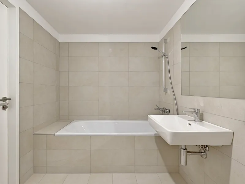 Moderne 2-Zimmer-Wohnung (ca. 57 m²) im Erdgeschoss mit privater Gartenterrasse (ca. 9 m²) und kleinem Gartenanteil (rund 1,5 m²). Die durchdachte Raumaufteilung umfasst eine großzügige Wohnküche, ein ruhiges Schlafzimmer und ein geräumiges Bad – alles hochwertig verarbeitet: Eichenparkett, Markenfliesen, Fußbodenheizung, Sonnenschutz und moderne Gebäudetechnik.