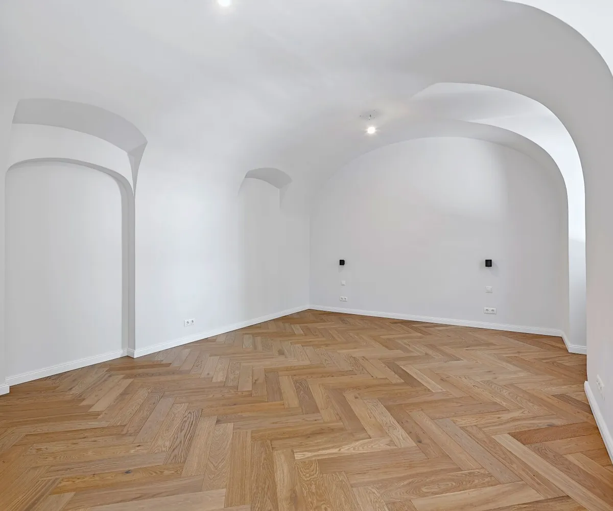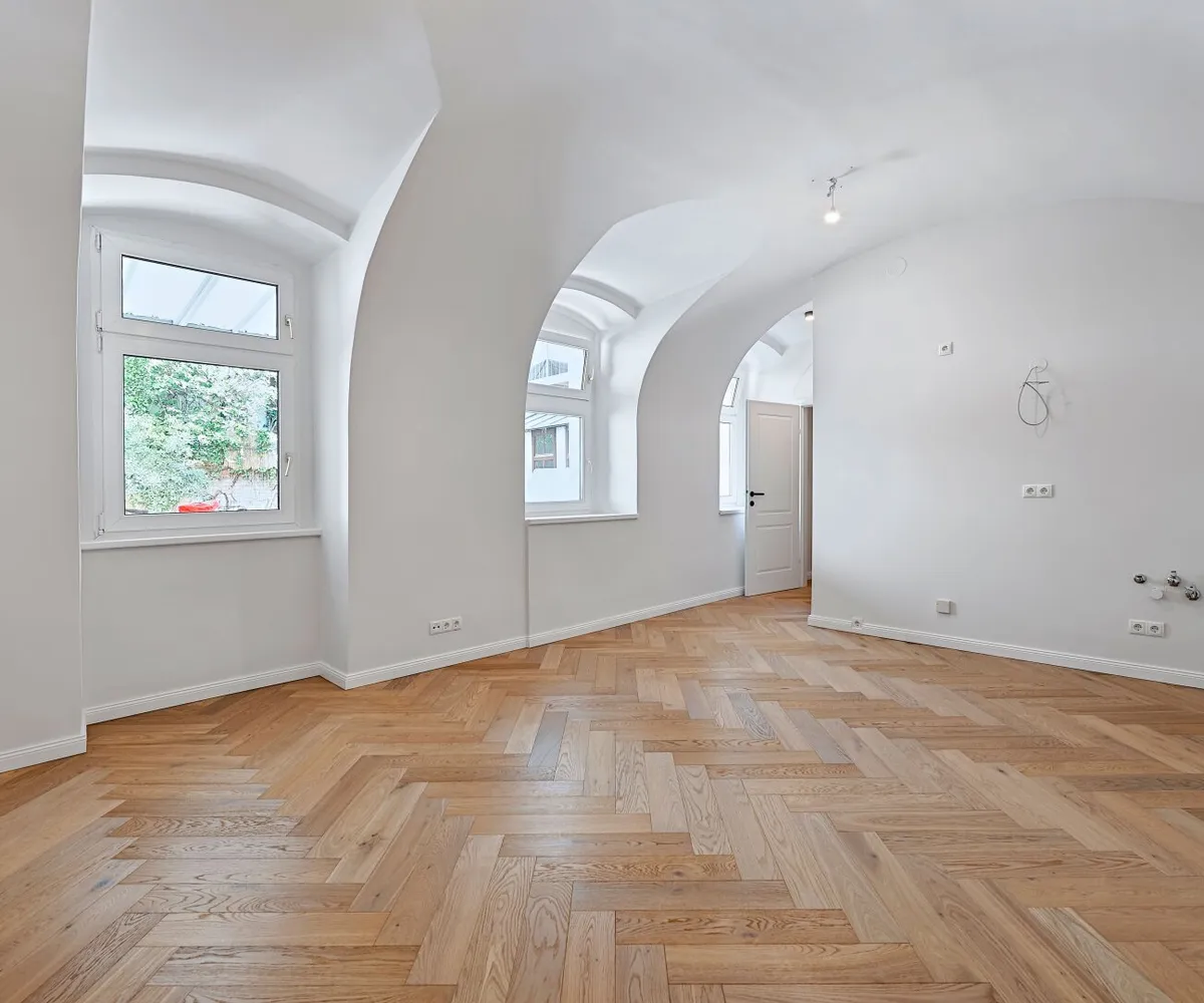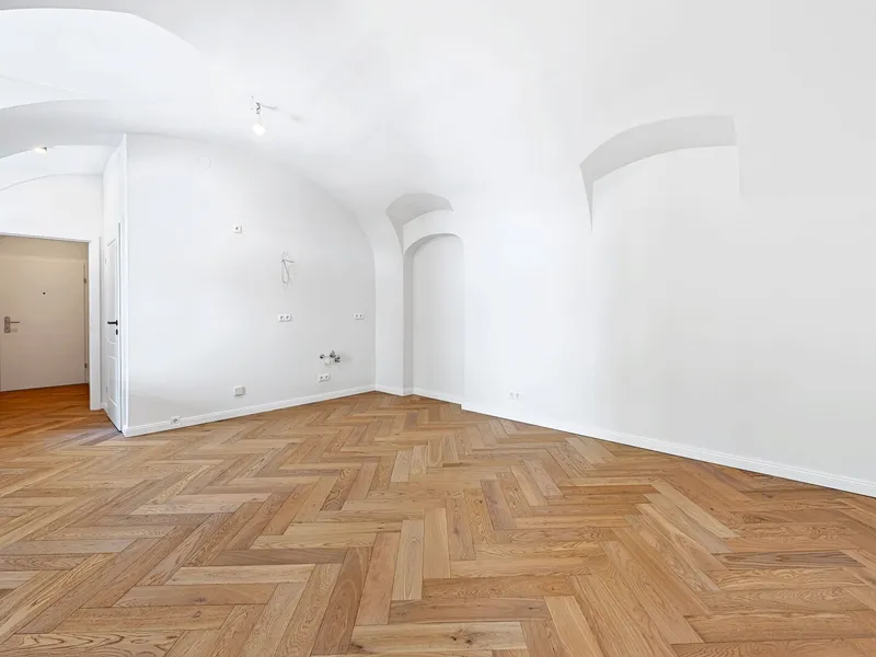 Über den Vorraum mit Platz für eine Garderobe, gelangt man in das moderne Badezimmer und das gemütliche Wohn-/Schlafzimmer mit ca. 23 qm. Das Bad bietet Platz für eine Dusche, ein WC, ein Handwaschbecken sowie einen Handtuchheizkörper. Der Wohnraum verleiht durch seine charmante Gewölbedecke und behaglichem Eichenparkett ein angenehmes Wohngefühl. Die Raumhöhe beträgt ca. 3 m.