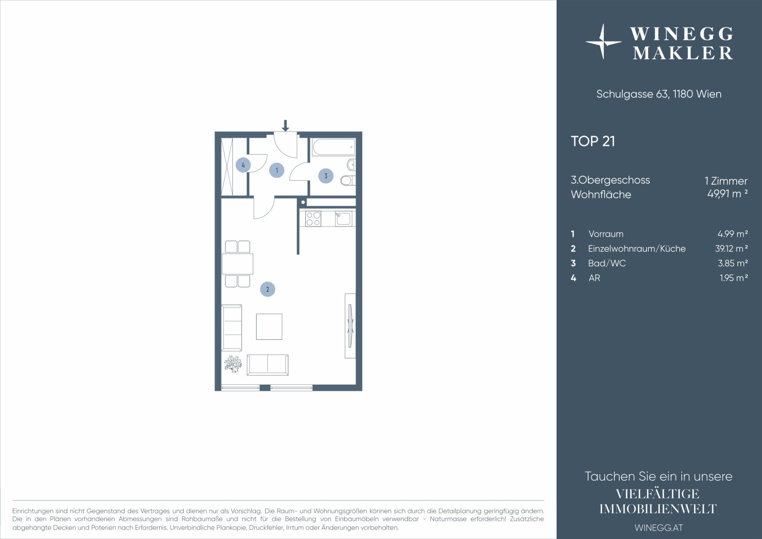 Die verkaufsgegenständliche Wohnung ist eine gut aufgeteilte Single-Wohnung. Auf knapp 50 m2 Wohnfläche finden sich:
