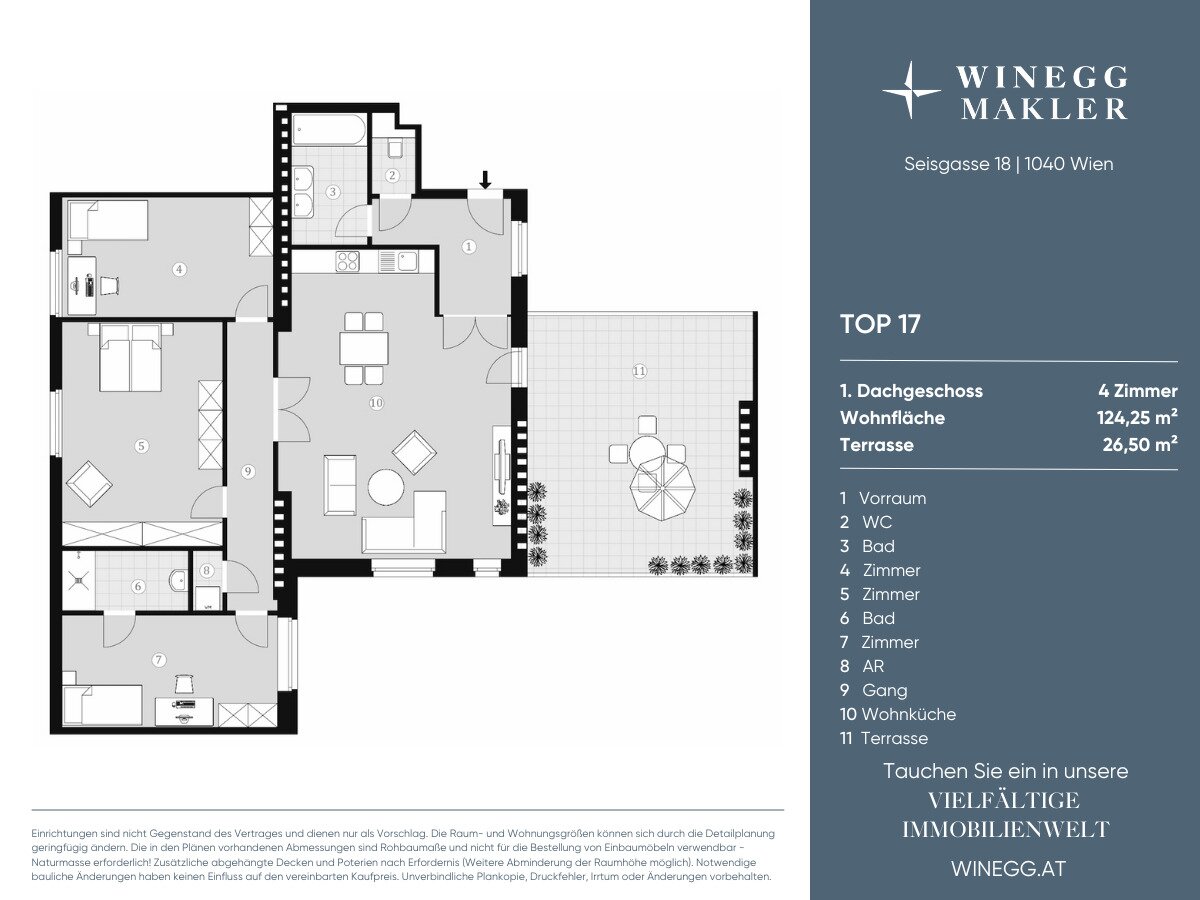 Denn in dieser 124m2 Dachterrassen-Wohnung sind Sie „on top“. 4-Zimmer Dachgeschoßwohnung vom Feinsten mit über 40m2 zentraler Wohnküche und einer 26m2 Terrasse - klingt bezaubernd, ist es auch. In dieser luxuriösen Wohnung werden Sie und Ihre Liebsten sich ganz und gar wohlfühlen. 3 Schlafzimmer, 2 Badezimmer, der Vorraum und das WC sind für Sie hochwertig und elegant ausgestattet und tragen so zu Ihrem Wohnkomfort bei. Einfach herrlich!