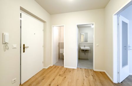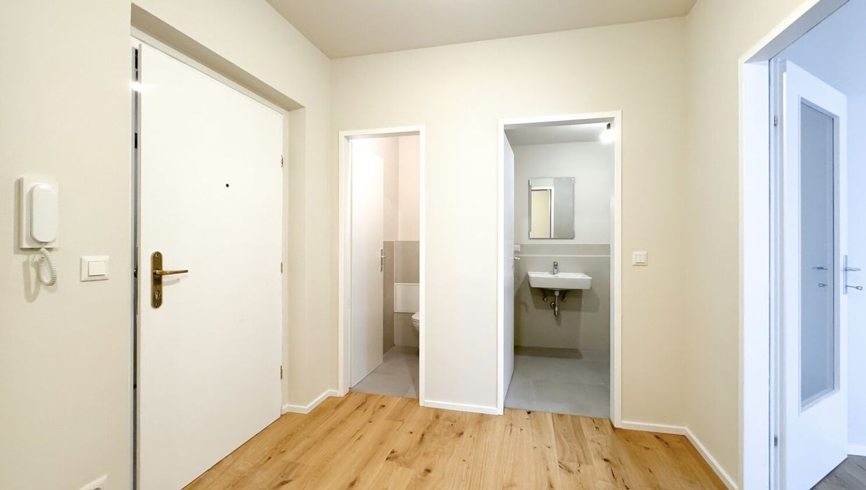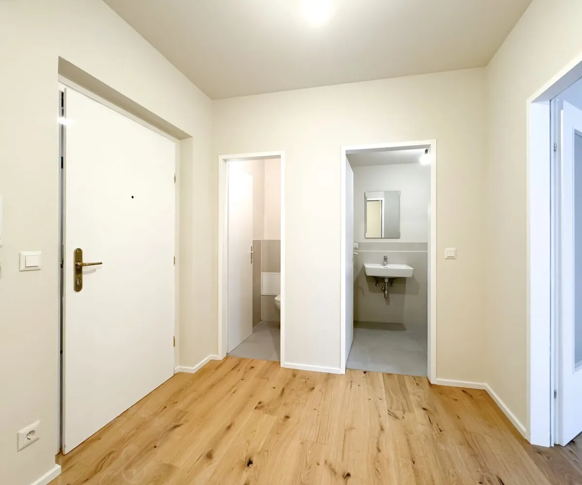 Vom zentral gelegenen Vorraum aus begeht man das Badezimmer (mit Badewanne), das separate WC und einen Abstellraum. Das hofseitig gelegene Wohnzimmer bietet eine angenehme Ruhelage im Herzen der Stadt.