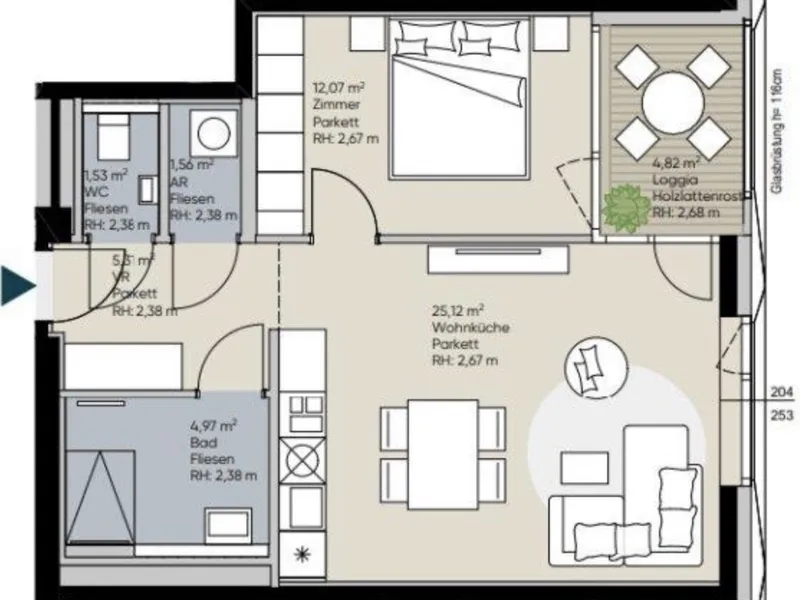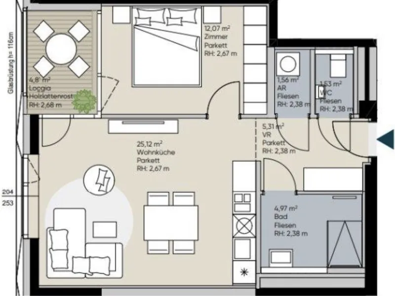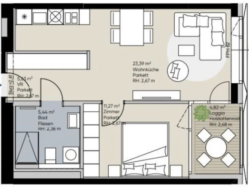 Die 2-Zimmer-Wohnung mit ca. 41 m² Wohnnutzfläche sowie einem Balkon befindet sich im 4. Obergeschoss.