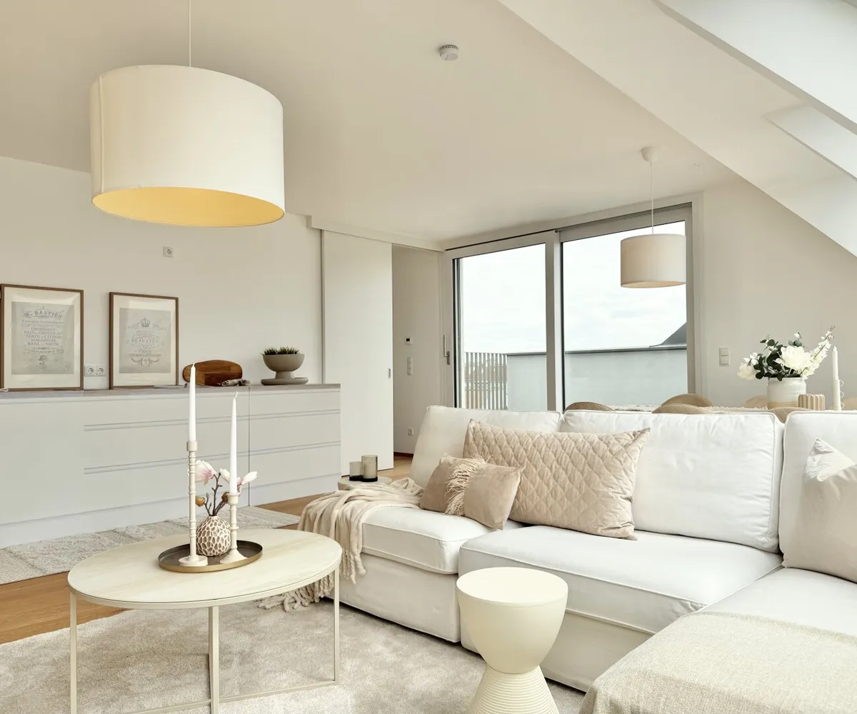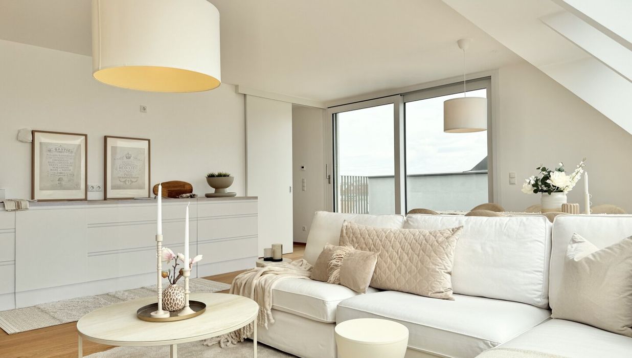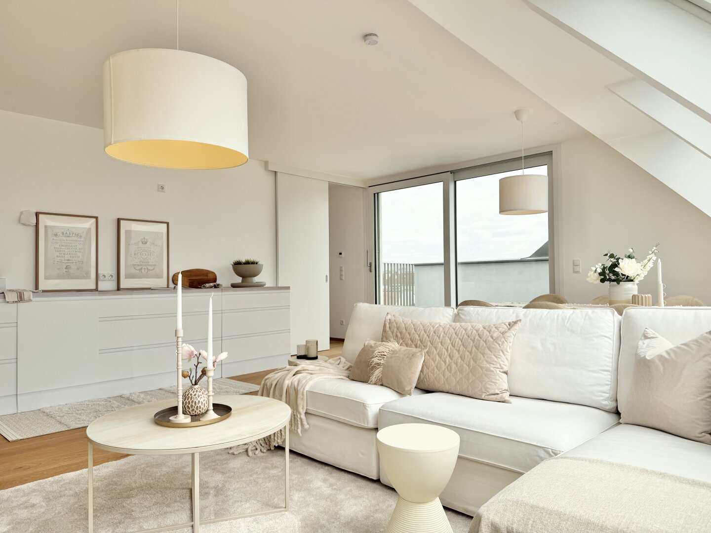 Das Penthouse selbst beeindruckt mit einer eleganten und modernen Gestaltung, die höchsten Wohnansprüchen gerecht wird. Großzügige Wohnbereiche bieten viel Platz für Entspannung und Unterhaltung, während die raumhohen Fensterflächen für eine lichtdurchflutete Atmosphäre sorgen und den Blick auf die umliegende Landschaft freigeben. Die erstklassige Ausstattung des Penthouse lässt keine Wünsche offen. Edle Eichenparkettböden, hochwertige Markensanitärprodukte und eine vollständig ausgestattete Küche verleihen dem Wohnraum einen Hauch von Luxus und Exklusivität. Eine Klimaanlage im Dachgeschoss sorgt auch an heißen Sommertagen für angenehme Temperaturen, während eine Paketboxenanlage und eine Videogegensprechanlage für Komfort und Sicherheit im Alltag sorgen.